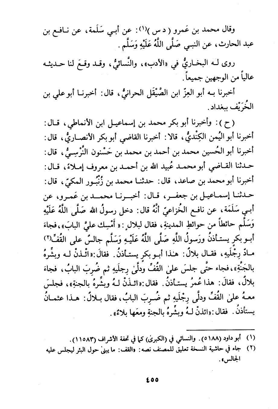 (ح) : وأخبرنا أَبُو بكر مُحَمَّد بْن إسماعيل ابْنُ الأَنْمَاطِيِّ، قال: أَخْبَرَنَا أَبُو اليُمْنِ الْكُنْدِيُّ، قَالا: أَخْبَرَنَا الْقَاضِي أَبُو بَكْرٍ الأَنْصارِيّ، قال: أَخْبَرَنَا أَبُو الْحُسَيْنِ مُحَمَّدُ بْنُ أَحْمَدَ بن مُحَمَّد بن حسنون النرسي، قال: حَدَّثَنَا الْقَاضِي أَبُو مُحَمَّدٍ عُبَيد اللَّه بْن أَحْمَدَ بْن مَعْرُوفٍ إِمْلاءً، قال: أَخْبَرَنَا أَبُو مُحَمَّد بْن صاعد، قال: حَدَّثَنَا مُحَمَّدُ بْنُ زُنْبُورٍ الْمَكِّيُّ، قال: حَدَّثَنَا إِسْمَاعِيلُ بْنُ جَعْفَرٍ، قال: أخبرنا مُحَمَّد بْنُ عَمْرو، عَن أَبِي سَلَمَةَ، عَنْ نَافِعٍ الْخُزَاعِيِّ أَنَّهُ قال: دَخَلَ رَسُولُ اللَّهِ صَلَّى اللَّهُ عَلَيْهِ وسَلَّمَ حَائِطًا مِنْ حَوَائِطِ الْمَدِينَةِ، فَقَالَ لِبِلالٍ: أَمْسِكْ عَلَيَّ الْبَابَ"، فَجَاءَ أَبُو بَكْرٍ يَسْتَأْذِنُ ورَسُولُ اللَّهِ صَلَّى اللَّهُ عَلَيْهِ وسَلَّمَ جَالِسٌ عَلَى الْقُفِّ (2) مَادٌّ رِجْلَيْهِ، فَقَال بِلالٌ: هَذَا أَبُو بَكْرٍ يَسْتَأْذِنُ. فَقَالَ: ائْذَنْ لَهُ وبَشِّرْهُ بِالْجَنَّةِ"، فَجَاءَ حَتَّى جَلَسَ عَلَى الْقُفِّ ودَلَّى رِجْلَيْهِ ثُمَّ ضُرِبَ الْبَابُ، فَجَاءَ بِلالٌ، فَقَالَ: هَذَا عُمَر يَسْتَأْذِنُ. فَقَالَ: ائْذَنْ لَهُ وبَشِّرْهُ بِالْجَنَّةِ"، فَجَلَسَ مَعَهُ عَلَى الْقُفِّ ودَلَّى رِجْلَيْهِ ثُمَّ ضُرِبَ الْبَابُ، فَقَالَ بِلالٌ: هَذَا عُثْمَانُ يَسْتَأْذِنُ. فَقَالَ: ائْذَنْ لَهُ وبَشِّرْهُ بِالْجَنَّةِ ومَعَهَا بلاء.