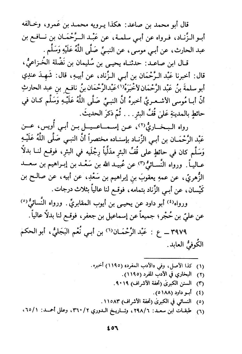 قال ابن صاعد: حَدَّثَنَا يَحْيَى بْنُ سُلَيْمان بْنِ نضلة الخزاعي، قال: أَخْبَرَنَا عَبْد الرحمن بْن أَبي الزناد، عَن أبيه، قال: شهد عندي أَبُو سلمة بْن عَبْد الرَّحْمَن لأخبره (1) عَبْد الرَّحْمَن بن نافع بن عَبْد الحارث أن أبا موسى الأشعري أخبره أن النبي صَلَّى اللَّهُ عَلَيْه وسَلَّمَ كَانَ فِي حائط بالمدينة على قف البئر ... ثم ذكر الحديث.