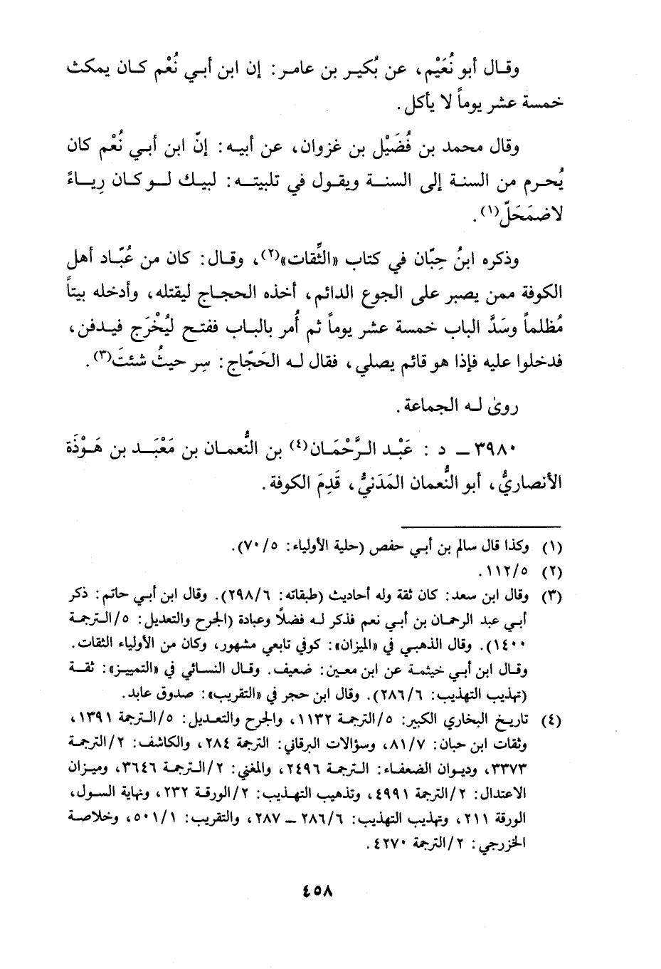 (3) وَقَال ابن سعد: كان ثقة وله أحاديث (طبقاته: 6 / 298) . وَقَال ابن أَبي حاتم: ذكر أبي عَبْدُ الرَّحْمَنِ بْنُ أَبي نُعْمٍ فذكر له فضلا وعبادة (الجرح والتعديل: 5 / الترجمة 1400) . وَقَال الذهبي في "الميزان": كوفي تابعي مشهور، وكان من الاولياء الثقات. وَقَال ابن أَبي خيثمة عن ابن مَعِين: ضعيف. وَقَال النَّسَائي في "التمييز": ثقة (تهذيب التهذيب: 6 / 286) . وَقَال ابن حجر في "التقريب": صدوق عابد.