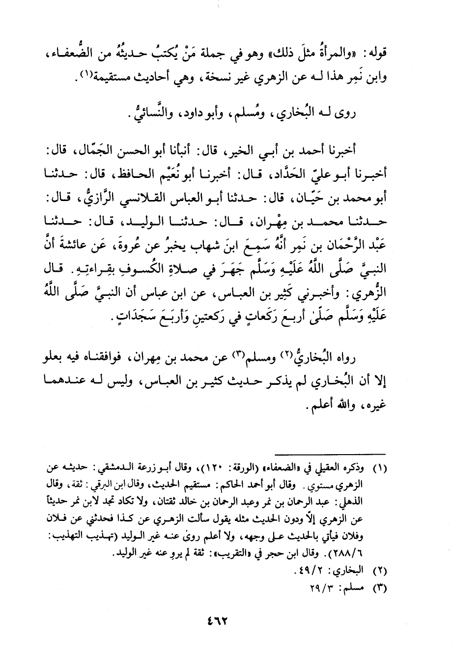 أَخْبَرَنَا أَحْمَد بْن أَبي الخير، قال: أَنْبَأَنَا أَبُو الْحَسَنِ الْجَمَّالُ، قال: أَخْبَرَنَا أَبُو عَلِيّ الحداد، قال: أَخْبَرَنَا أَبُو نُعَيْمٍ الْحَافِظُ، قال: حَدَّثَنَا أَبُو مُحَمَّدِ بْنُ حَيَّانَ، قال: حَدَّثَنَا أَبُو الْعَبَّاسِ الْقَلانِسِيُّ الرَّازِيُّ، قال: حَدَّثَنَا مُحَمَّدُ بْنُ مِهْرَانَ، قال: حَدَّثَنَا الْوَلِيدُ، قال: حَدَّثَنَا عَبْد الرحمن بْن نَمِرٍّ أَنَّهُ سَمِعَ ابْنَ شِهَابٍ يُخْبِرُ عَنْ عُرْوَةَ، عَنْ عَائِشَةَ أَنَّ النَّبِيَّ صلى الله عليه وسَلَّمَ جَهِرَ فِي صَلاةِ الْكُسُوفِ بِقِرَاءَتِهِ. قال الزُّهْرِيّ: وأَخْبَرَنِي كَثِيرُ بْنُ الْعَبَّاسِ، عَنِ ابْنِ عَبَّاسٍ أَنَّ النَّبِيَّ صلى الله عليه وسَلَّمَ صَلَّى أَرْبَعَ رَكَعَاتٍ فِي رَكْعَتَيْنِ وأَرْبَعَ سَجَدَاتٍ.