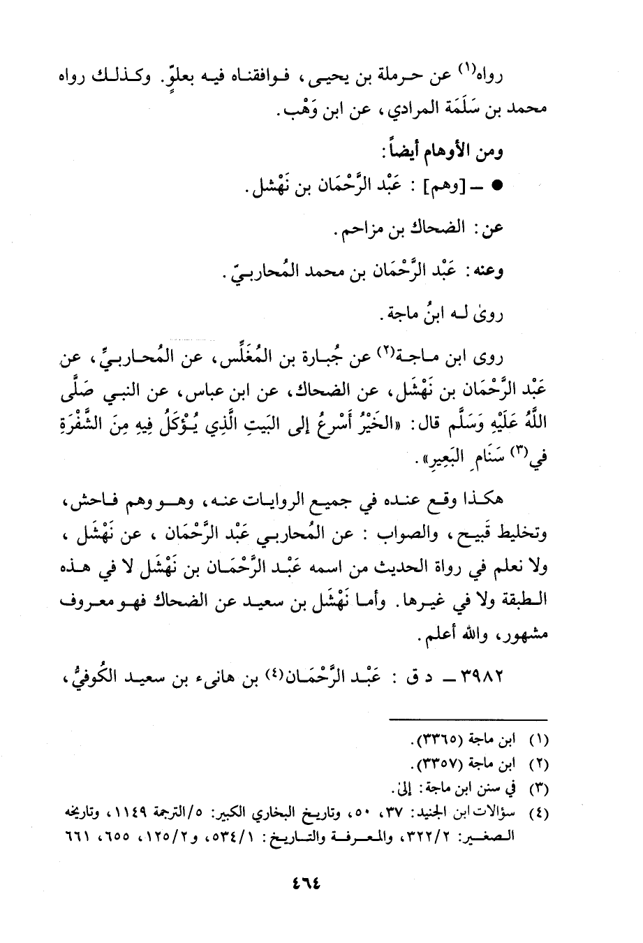 هكذا وقع عنده فِي جميع الروايات عنه، وهو وهم فاحش، وتخليط قبيح، والصواب: عَنِ المحاربي عَبْد الرَّحْمَن، عَنْ نهشل، ولا نعلم فِي رواة الحديث من اسمه عَبْد الرَّحْمَن بْن نهشل لا فِي هذة الطبقة ولا فِي غيرها. وأما نهشل بْن سَعِيد عَنِ الضحاك فهو معروف مشهور، والله أعلم.