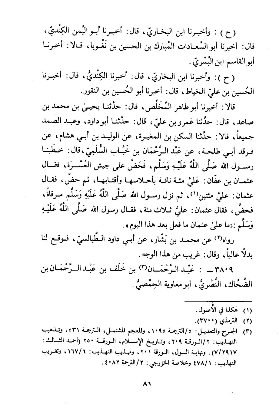 قَالا: أَخْبَرَنَا أَبُو طَاهِرٍ الْمُخَلِّصُ، قال: حَدَّثَنَا يحيى بْن مُحَمَّد بْنِ صَاعِدٍ، قال: حَدَّثَنَا عَمْرو بْنُ عَلِيٍّ، قال: حَدَّثَنَا أَبُو دَاوُدَ، وعَبْدُ الصَّمَدِ جَمِيعًا، قَالا: حَدَّثَنَا السَّكَنُ بْنُ الْمُغِيرَةِ، عَنِ الْوَلِيدِ بْنِ أَبي هِشَامٍ، عَنْ فَرْقَدٍ أَبِي طَلْحَةَ، عَنْ عَبْدِ الرَّحْمَنِ بْنِ خَبَّابٍ السَّلْمِيِّ، قال: خَطَبَنَا رَسُولُ اللَّهِ صَلَّى اللَّهُ عَلَيْهِ وسَلَّمَ، فَحَضَّ عَلَى جَيْشِ الْعُسْرَةِ، فَقَالَ عُثْمَانُ بْنُ عَفَّانَ: علي مئة نَاقَةً بِأَحْلاسِهَا وأَقْتَابِهَا، ثُمَّ حَضَّ، فقال عثمان: علي مئتين (1) ، ثُمَّ نزل رَسُول اللَّهِ صَلَّى اللَّهُ عَلَيْهِ وسَلَّمَ مِرْقَاةً، فَحَضَّ، فقال عثمان: علي ثلاث مئة، فَقَالَ رَسُولُ اللَّهِ صلى الله عَلَيْهِ وسَلَّمَ: مَا عَلَى عُثْمَانَ مَا فَعَلَ بَعْدَ هَذَا الْيَوْمِ.
