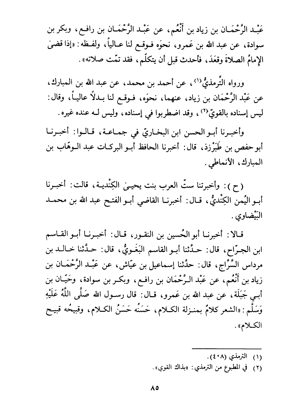 قَالا: أَخْبَرَنَا أَبُو الحسين بْن النقور، قال: أخبرنا أبو القاسم ابن الْجَرَّاحِ، قال: حَدَّثَنَا أَبُو الْقَاسِمِ الْبَغَوِيُّ، قال: حَدَّثَنَا خَالِدُ بْنُ مِرْدَاسٍ السَّرَّاجُ، قال: حَدَّثَنَا إِسْمَاعِيلُ بْنُ عَيَّاشٍ، عَنْ عَبْدِ الرَّحْمَنِ بْنُ زِيَادِ بْنِ أَنْعُمٍ، عَنْ عَبْد الرَّحْمَن بْن رافع، وبكر بْنُ سَوَادَةَ وحِيَّانُ بْنُ أَبي جَبْلَةَ، عَنْ عَبد اللَّهِ بْنِ عَمْرو، قال: قال رَسُولُ اللَّهِ صَلَّى اللَّهُ عَلَيْهِ وسَلَّمَ: الشِّعْرُ كَلامٌ بِمَنْزِلَةِ الْكَلامِ، حَسَنُهُ حَسَنُ الكلام، وقبيحه قبيح الكلام.