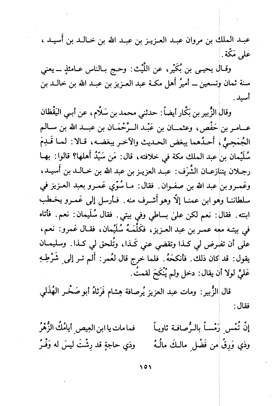 وَقَال الزبير بن بكار أيضا: حَدَّثَنِي محمد بن سلام، عَن أبي اليقظان عامر بن حفص، وعثمان بن عَبْد الرَّحْمَنِ بْن عَبد اللَّهِ بن سالم الجمحي، أحدهما يبغض الحديث والآخر يبغضه، قالا: لما قدم سُلَيْمان بن عَبد المَلِك مكة في خلافته، قال: من سيد أهلها؟ قَالُوا: بها رجلان يتنازعان الشرف: عبد العزيز بْن عَبد اللَّهِ بْن خالد بن أسيد، وعَمْرو بن عَبد الله بن صفوان.