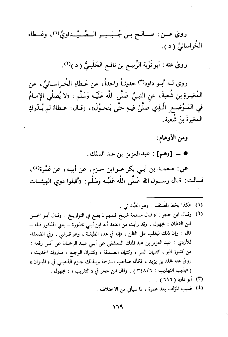 • [وَهْمٌ] عبد العزيز بن عبد الملك. عَن: مُحَمَّد بْن أَبي بَكْر هُوَ ابْنُ حَزْمٍ، عَن أَبِيهِ، عَنْ عُمَرة (4) ، قَالَتْ: قال رَسُولُ اللَّهِ صلى الله عليه وسلم: أقيلوا ذوي الهيئات