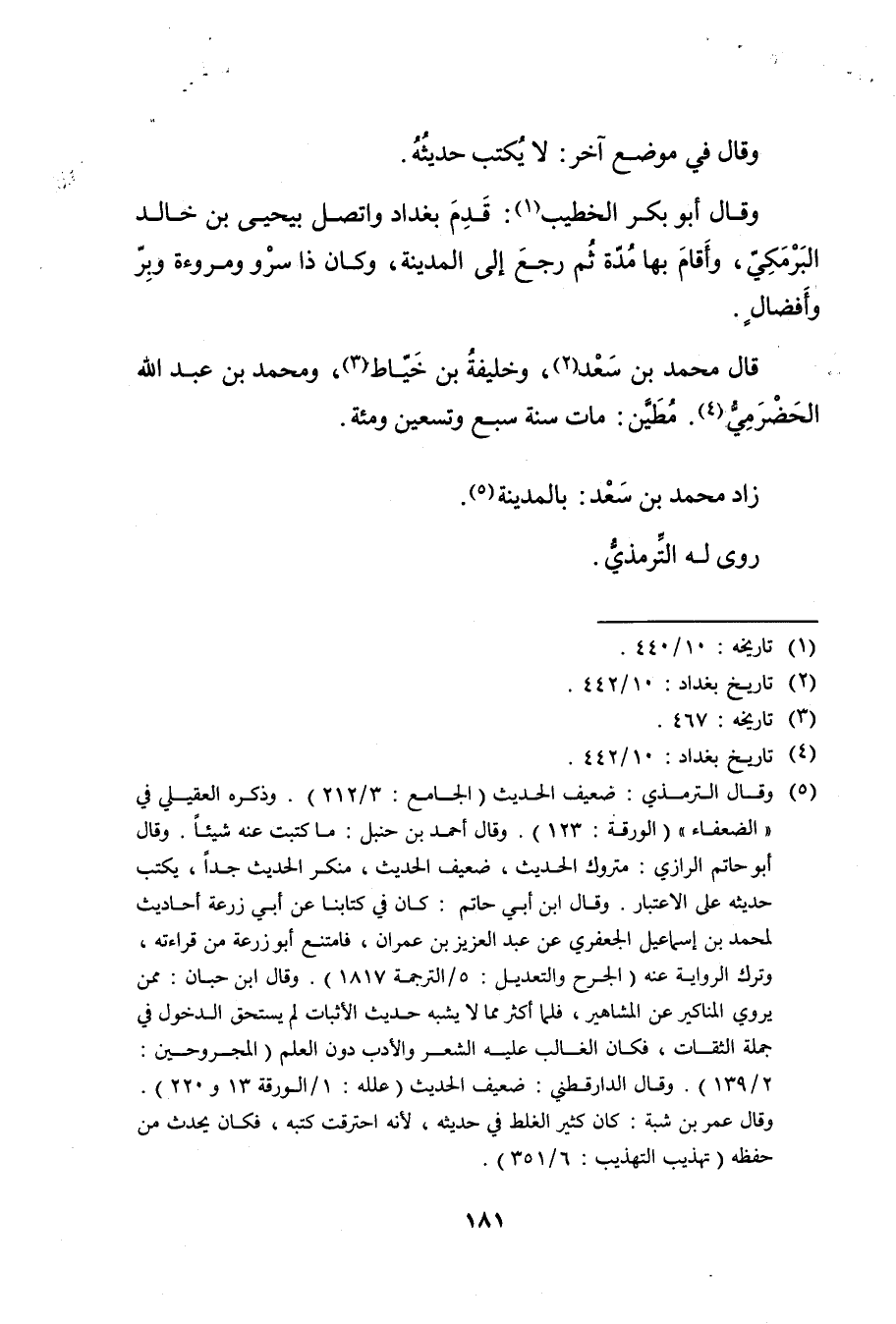(5) وَقَال التِّرْمِذِيّ: ضعيف الحديث (الجامع: 3 / 212) ، وذَكَره العقيلي في "الضعفاء" (الورقة 123) . وَقَال أَحْمَد بْن حنبل: ما كتبت عنه شيئا. وَقَال أبو حاتم الرازي: متروك الْحَدِيثِ، ضَعِيفُ الْحَدِيثِ، مُنْكَرُ الْحَدِيثِ جدا، يكتب حديثه على الاعتبار. وَقَال ابن أَبي حاتم: كان في كتابنا عَن أبي زرعة أحاديث لمحمد بن إسماعيل الجعفري عن عبد العزيز بن عِمْران، فامتنع أبو زُرْعَة من قراءته، وترك الرواية عنه (الجرح والتعديل: 5 / الترجمة 1817) . وَقَال ابن حبان: ممن يروي المناكير عن المشاهير، فلما أكثر مما لا يشبه حديث الاثبات لم يستحق الدخول في جملة الثقات، فكان الغالب عليه الشعر والادب دون العلم (المجروحين: 2 / 139) . وَقَال الدَّارَقُطنِيّ: ضعيف الحديث (علله: 1 / الورقة 13 و220) . وَقَال عُمَربن شبة: كان كثير الغلط في حديثه، لانه احترقت كتبه، فكان يحدث من حفظه (تهذيب التهذيب: 6 / 351) .