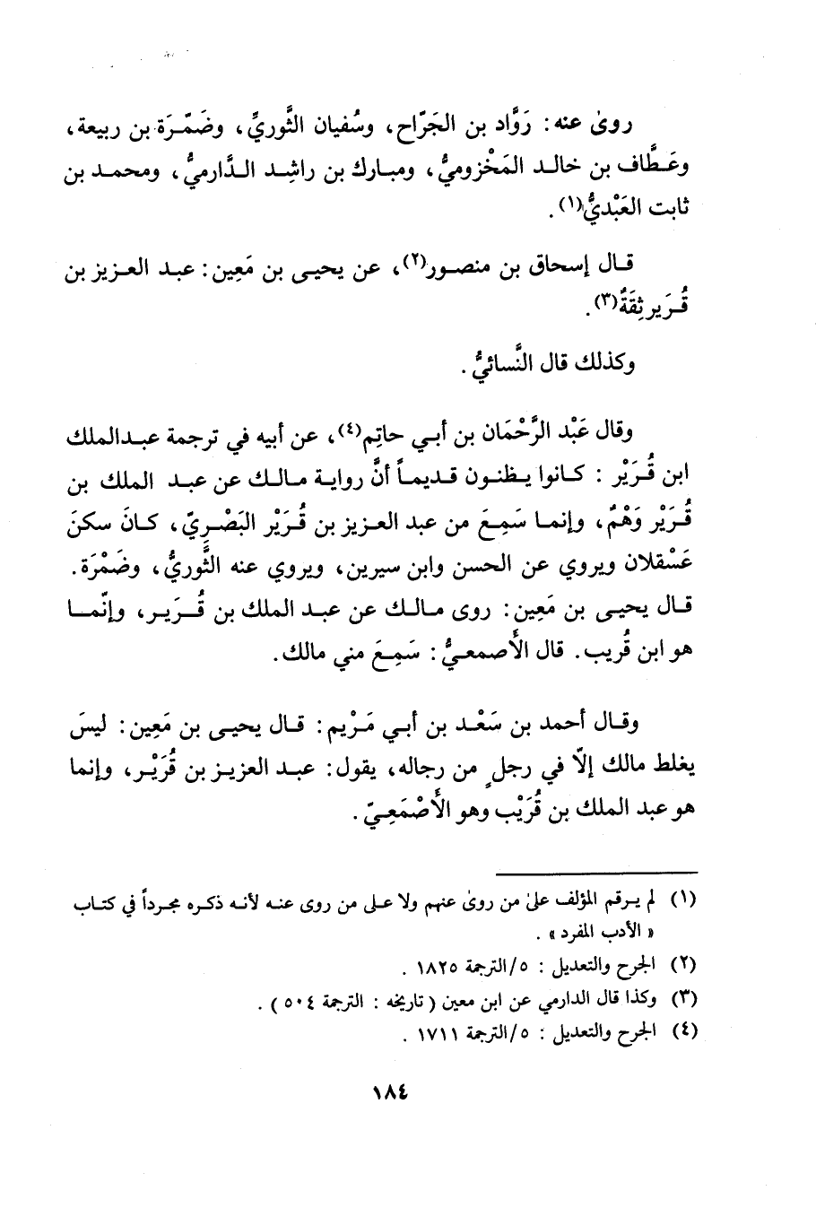 وَقَال عَبْد الرَّحْمَنِ بْن أَبي حَاتِم (4) ، عَن أَبِيهِ في ترجمة عَبد المَلِك ابن قرير: كانوا يظنون قديما أن رواية مالك عَنْ عَبد المَلِك بن قرير وهم، وإنما سمع من عبد العزيز بن قرير البَصْرِيّ، كان سكن عسقلان ويروي عن الحسن وابن سيرين، ويروي عنه الثوري، وضمرة. قال يحيى بن مَعِين: روى مالك عَنْ عَبد المَلِك بن قرير، وإنما هو ابن قريب. قال الأَصْمَعِيّ: سمع مني مالك.