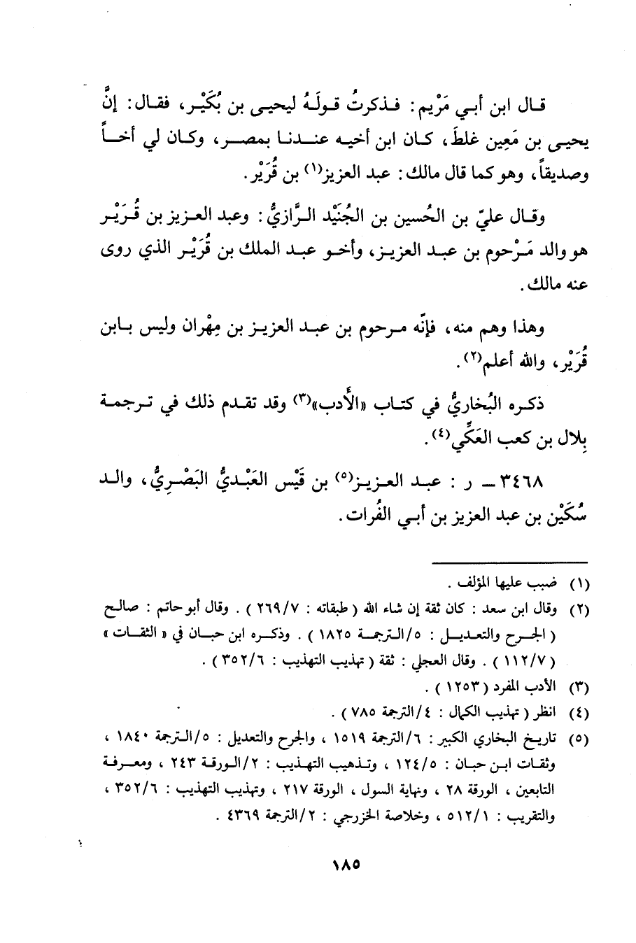 قال ابن أَبي مريم: فذكرت قوله ليحيى بن بكير، فقال: إن يحيى بن مَعِين غلط، كان ابن أخيه عندنا بمصر، وكان لي أخا وصديقا، وهو كما قال مالك: عبد العزيز (1) بن قرير.
