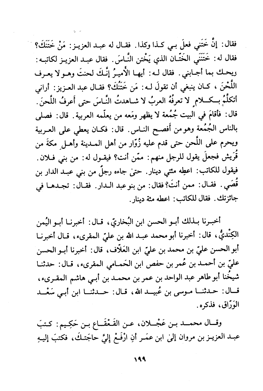فقال: إن ختني فعل بي كذا وكذا. فقال له عبد العزيز: من ختنك؟ فقال له: ختنني الختان الذي يختن الناس. فقال عبد العزيز لكاتبه: ويحك بما أجابني. فقال له: أيها الأمير إنك لحنت وهو لا يعرف اللحن، كان ينبغي أن تقول له: من ختنك؟ فقال عبد العزيز: أراني أتكلم بكلام لا تعرفه العرب لا شاهدت الناس حتى أعرف اللحن. قال: فأقام في البيت جمعة لا يظهر ومعه من يعلمه العربية. قال: فصلى بالناس الجمعة وهو من أفصح الناس. قال: فكان يعطي على العربية ويحرم على اللحن حتى قدم عليه زوار من أهل المدينة وأهل مكة من قريش فجعل يقول للرجل منهم: ممن أنت؟ فيقول له: من بني فلان. فيقول للكاتب: أعطه مئتي دينار. حتى جاءه رجل من بني عبد الدار بن قصي. قال: ممن أنت؟ فقال: من بنو عبد الدار. فقال: تجدها في جائزتك.
