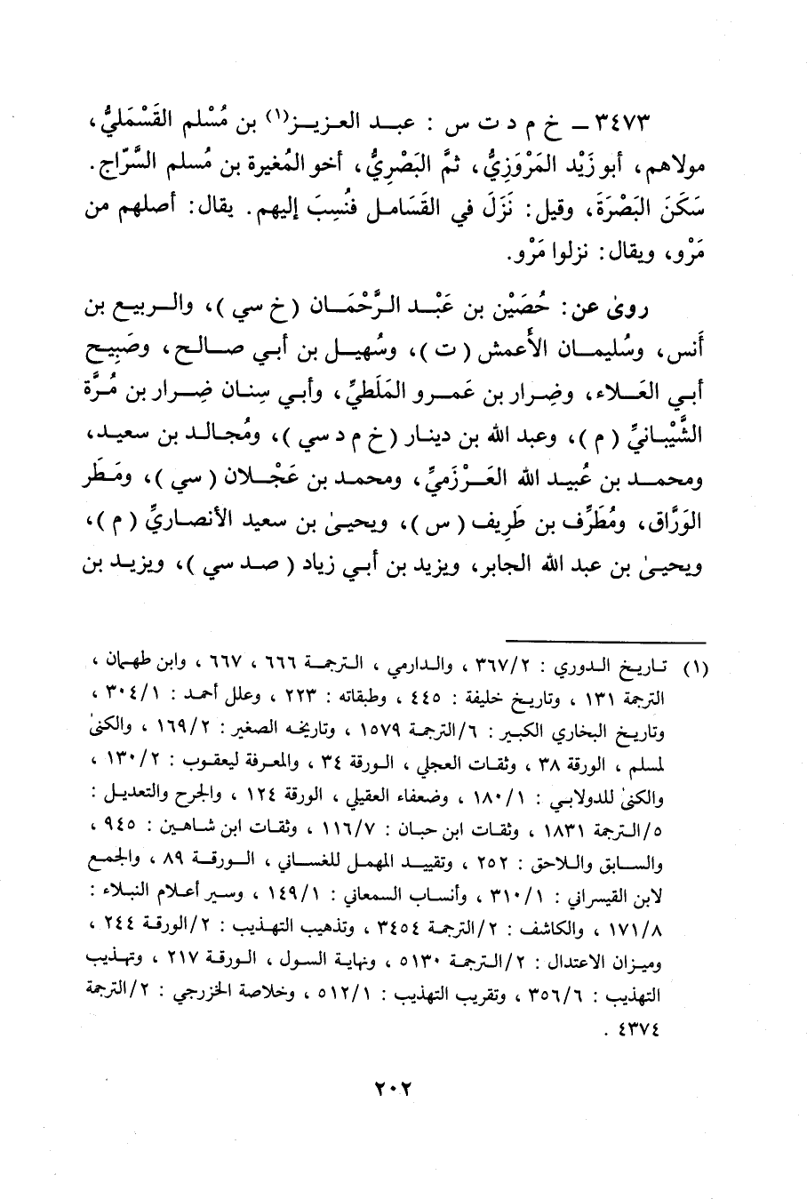 3473 - خ م د ت س: عبد العزيز بن مسلم القسملي (1) ، مولاهم أبو زيد المروزي، ثم البَصْرِيّ، أخو المغيرة بن مسلم السراج. سكن البصرة، وقيل: نزل في القسامل فنسب إليهم.