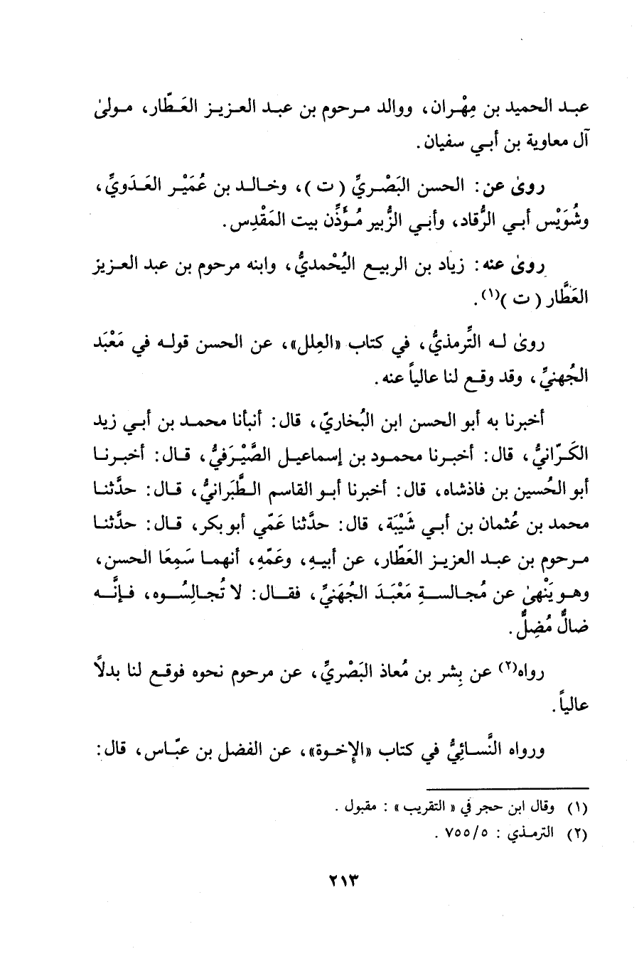 أَخْبَرَنَا بِهِ أَبُو الْحَسَنِ بْنُ الْبُخَارِيِّ، قال: أَنْبَأَنَا مُحَمَّدُ بْنُ أَبي زَيْدٍ الْكَرَّانِيُّ، قال: أَخْبَرَنَا مَحْمُودُ بْنُ إِسْمَاعِيلَ الصَّيْرَفِيُّ، قال: أخبرنا أَبُو الحسين بْن فَاذْشْاهِ، قال: أخبرنا أَبُو الْقَاسِمِ الطَّبَرَانِيُّ، قال: حَدَّثَنَا مُحَمَّدُ بْنُ عثمان بْن أَبي شَيْبَة، قال: حَدَّثَنَا عمي أبو بكر، قال: حَدَّثَنَا مرحوم بن عبد العزيز العطار، عَن أَبِيهِ، وعمه، أنهما سمعا الحسن، وهو ينهى عن مجالسة معبد الجهني، فقال: لا تجالسوه، فإنه ضال مضل.