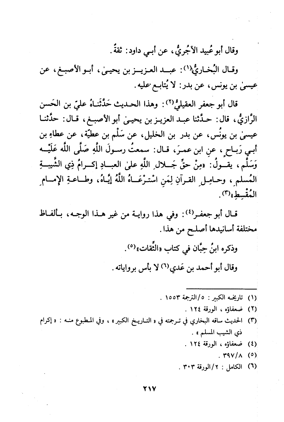 الرَّازِيُّ، قال: حَدَّثَنَا عَبْدُ الْعَزِيزِ بْنُ يَحْيَى أَبُو الأَصْبَغِ، قال: حَدَّثَنَا عِيسَى بْنُ يُونُسَ، عَنْ بَدْرِ بْنِ الْخَلِيلِ، عَنْ سَلْمِ بْنِ عَطِيَّةَ، عَنْ عَطَاءِ بْنِ أَبي رَبَاحٍ، عَنِ ابْنِ عُمَر، قال: سَمِعْتُ رَسُولَ اللَّهِ صَلَّى اللَّهُ عَلَيْهِ وسَلَّمَ، يَقُولُ: مَنْ حَقِّ جَلالِ اللَّهِ عَلَى الْعِبَادِ إِكْرَامُ ذِي الشَيْبَة الْمُسْلِمِ، وحَامِلِ الْقُرْآنِ لِمَنِ اسْتَرْعَاهُ اللَّهُ إِيَّاهُ، وطَاعَةُ الإِمَامِ الْمُقْسِطِ" (3) .