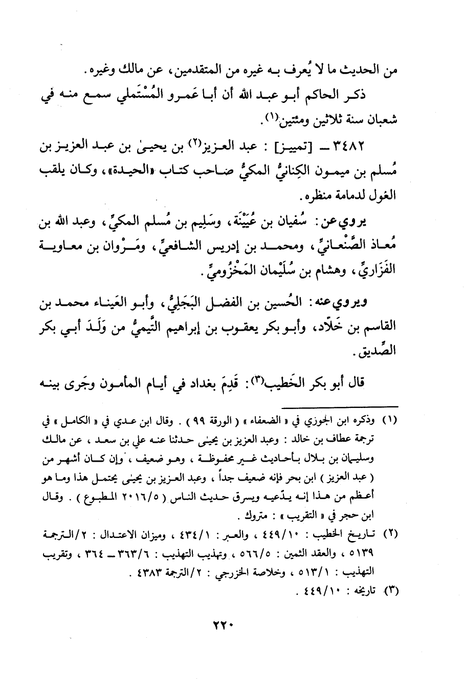 3482 - تمييز: عبد العزيز بن يحيى بن عبد العزيز بن مسلم بن ميمون الكناني المكي (2) صاحب كتاب"الحيدة"، وكان يلقب الغول لدمامة منظره.