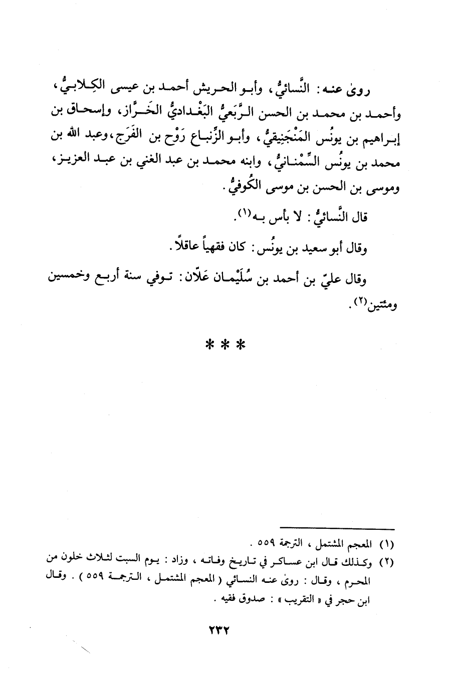 (2) وكذلك قال ابن عساكر في تاريخ وفاته، وزاد: يوم السبت لثلاث خلون من المحرم، وَقَال: روى عنه النَّسَائي (المعجم المشتمل، الترجمة 559) . وَقَال ابن حجر في "التقريب": صدوق فقيه.