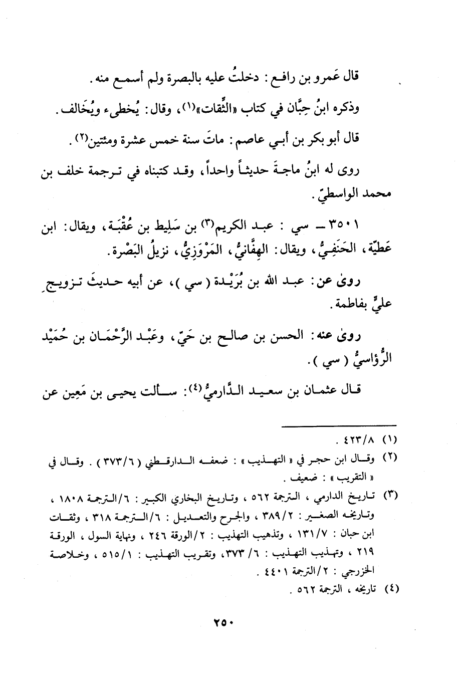 (3) تاريخ الدارمي، الترجمة 562، وتاريخ البخاري الكبير: 6 \ الترجمة 1808، وتاريخه الصغير: 2 \ 389، والجرح والتعديل: 6 \ الترجمة 318، وثقات ابن حبان: 7 \ 131، وتذهيب التهذيب: 2 \ الورقة 246، ونهاية السول، الورقة 219، وتهذيب التهذيب: 6 \ 373، وتقريب التهذيب: 1 \ 515، وخلاصة الخزرجي: 2 \ الترجمة 4401.
