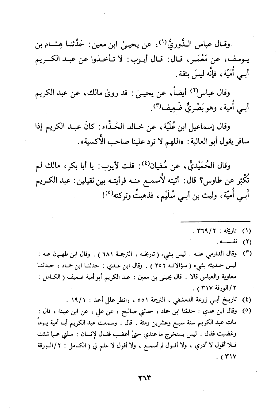 (3) وَقَال الدارمي عَنه: ليس بشيءٍ (تاريخه، الترجمة 681) . وَقَال ابن طهمان عَنه: ليس حديثه بشيءٍ (سؤالاته 252) . وَقَال ابن عدي: حَدَّثَنَا ابن حماد، حَدَّثَنَا معاوية والعباس قالا: قال يحيى بن مَعِين: عبد الكريم أبو أمية ضعيف (الكامل: 2 \ الورقة 317) .
