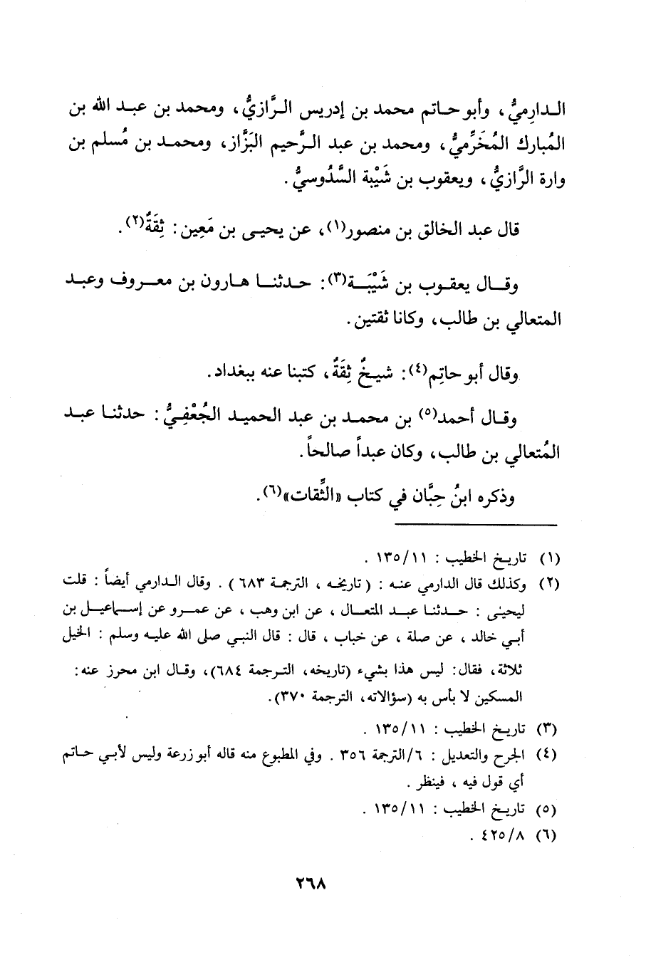 (2) وكذلك قال الدارمي عَنه: (تاريخه، الترجمة 683) . وَقَال الدارمي أيضا: قلت ليحيى: حَدَّثَنَا عبد المتعال، عَنِ ابْنِ وهْبٍ، عَنْ عَمْرو عن إِسْمَاعِيل بْن أَبي خالد، عن صلة، عن خباب، قال: قال النبي صَلَّى اللَّهُ عليه وسلم: الخيل ثلاثة، فقال: ليس هذا بشيءٍ (تاريخه، الترجمة 684) ، وَقَال ابن محرز عَنه: المسكين لا بأس به (سؤالاته، الترجمة 370) .