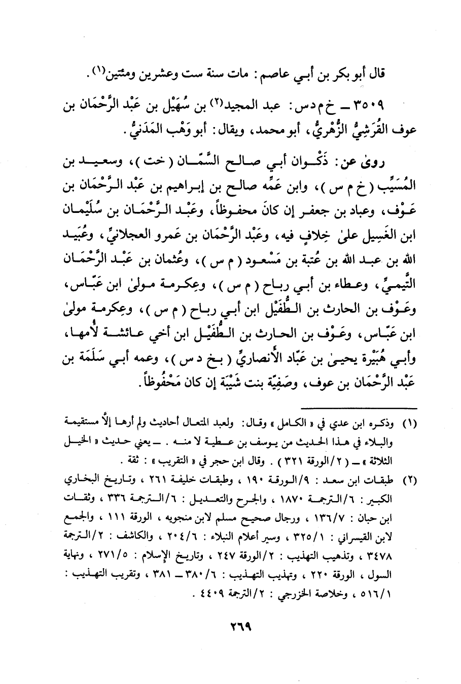 3509 - خ م د س: عَبد المجيد بْن سهيل بْن عَبْد الرحمن بن عوف القرشي الزُّهْرِيّ (2) ، أبو محمد، ويُقال: أبو وهب المدني.