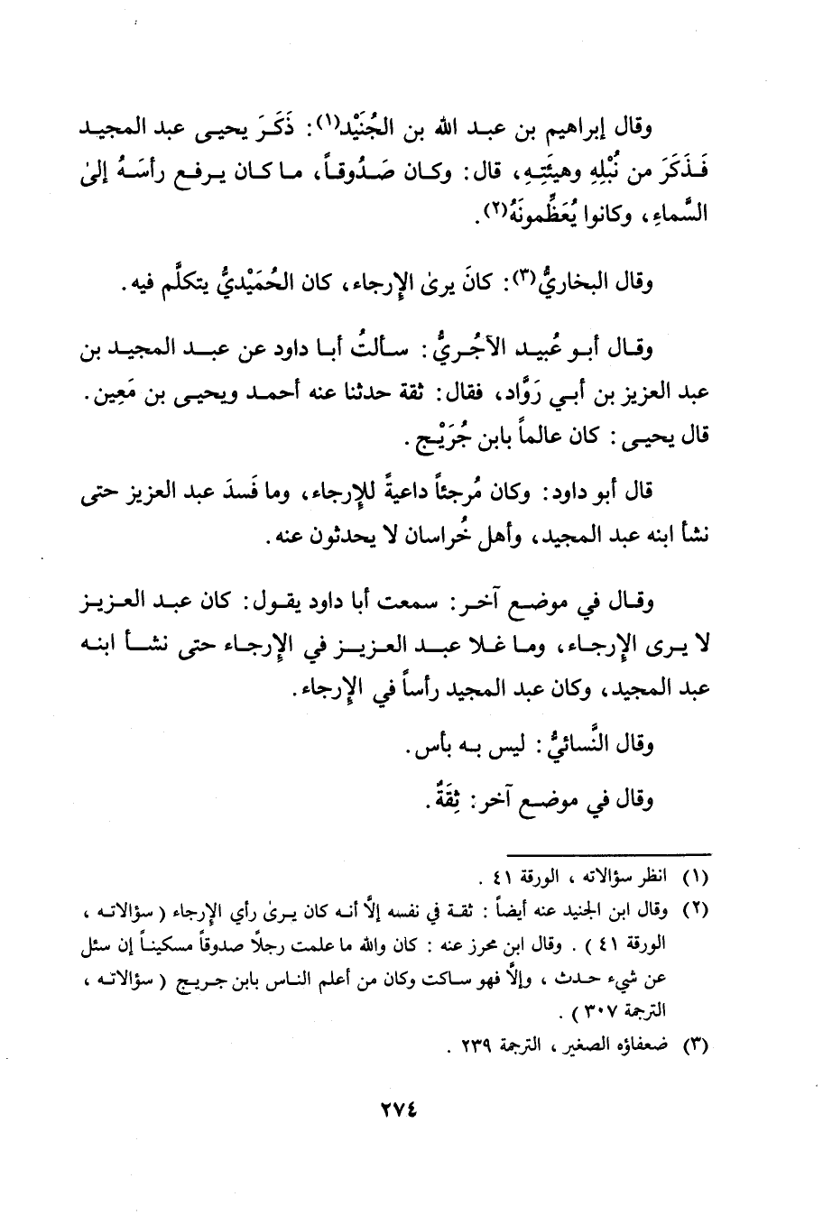 (2) وَقَال ابن الجنيد عنه أيضا: ثقة في نفسه إلا أنه كان يرى رأي الارجاء (سؤالاته، الورقة 41) . وَقَال ابن محرز عَنه: كان والله ما علمت رجلا صدوقا مسكينا إن سئل عن شيء حدث، وإلا فهو ساكت وكان من أعلم الناس بابن جُرَيْج (سؤالاته، الترجمة 307) .