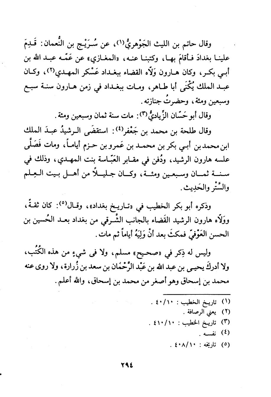 وذكره أبو بكر الخطيب في "تاريخ بغداد"، وَقَال (5) : كان ثقة، وولاه هارون الرشيد القضاء بالجانب الشرقي من بغداد بعد الحسين بن الحسن العوفي فمكث بعد أن وليه أياما ثم مات.