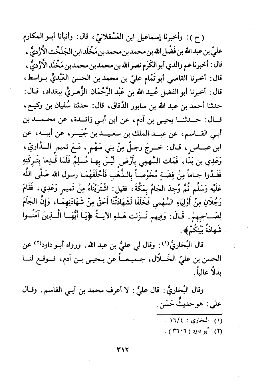(ح) : وأخبرنا إِسْمَاعِيلُ ابْنُ الْعَسْقَلانِيُّ، قال: وأنبأنا أَبُو الْمَكَارِمِ عَلِيُّ بْنُ عَبد اللَّهِ بْنِ فَضْلِ اللَّهِ بْن مُحَمَّد بْن مُحَمَّد بن مخلد ابن الْجَلَخْتِ الأَزْدِيُّ، قال: أخبرنا عَمُّ والِدِي أَبُو الْكَرَمِ نَصْرُ اللَّهِ بْن مُحَمَّد بْن مُحَمَّد بْن مَخْلَدٍ الأَزْدِيُّ، قال: أخبرنا الْقَاضِي أَبُو تَمَّامٍ عَلِيُّ بْنُ مُحَمَّدِ بْنِ الْحَسَنِ الْعَبْدِيُّ بِوَاسِطٍ، قال: أَخْبَرَنَا أَبُو الفضل عُبَيد اللَّه بْنُ عَبْدِ الرَّحْمَنِ الزُّهْرِيّ بِبَغْدَادَ، قال: حَدَّثَنَا أَحْمَدُ بْنُ عَبد اللَّهِ بْنِ سَابُورَ الدَّقَّاقُ، قال: حَدَّثَنَا سُفْيَانُ بْنُ وكِيعٍ، قال: حَدَّثَنَا يَحْيَى بْنُ آدَمَ، عَنِ ابْنِ أَبي زَائِدَةَ، عَنْ مُحَمَّدِ بْنِ أَبي الْقَاسِمِ، عَنْ عَبد المَلِك بْن سَعِيد بْن جبير، عَن أبيه، عن ابن عباس، قال: خَرَجَ رَجُلٌ مِنْ بَنِي سَهْمٍ، مَعَ تَمِيمٍ الدَّارِيِّ، وعَدِيِّ بن بَدَّا، فَمَاتَ السَّهْمِيُّ بِأَرِضٍ لَيْسَ بِهَا مُسْلِمٌ فَلَمَّا قَدِمَا بِتَرِكَتِهِ فَقَدُوا جَامًا مِنْ فِضَّةٍ مُخَوَّصًا بِالذَّهَبِ فَأَحْلَفَهُمَا رَسُولُ اللَّهِ صَلَّى اللَّهُ عَلَيْهِ وسَلَّمَ ثُمَّ وجِدَ الْجَامُ بِمَكَّةَ، فَقِيلَ: اشْتَرَيْنَاهُ مِنْ تَمِيمٍ وعَدِيٍّ، فَقَامَ رَجُلانِ من أولياء السهمي فخلفا لَشَهَادَتُنَا أَحَقُّ مِنْ شَهَادَتِهِمَا، وإِنَّ الْجَامَ لِصَاحِبِهِمْ. قال: وفِيهِمْ نَزَلَتْ هَذِهِ الآيَةُ (يا أيها الذين آمَنُوا شَهَادَةُ بَيْنَكُمْ) .