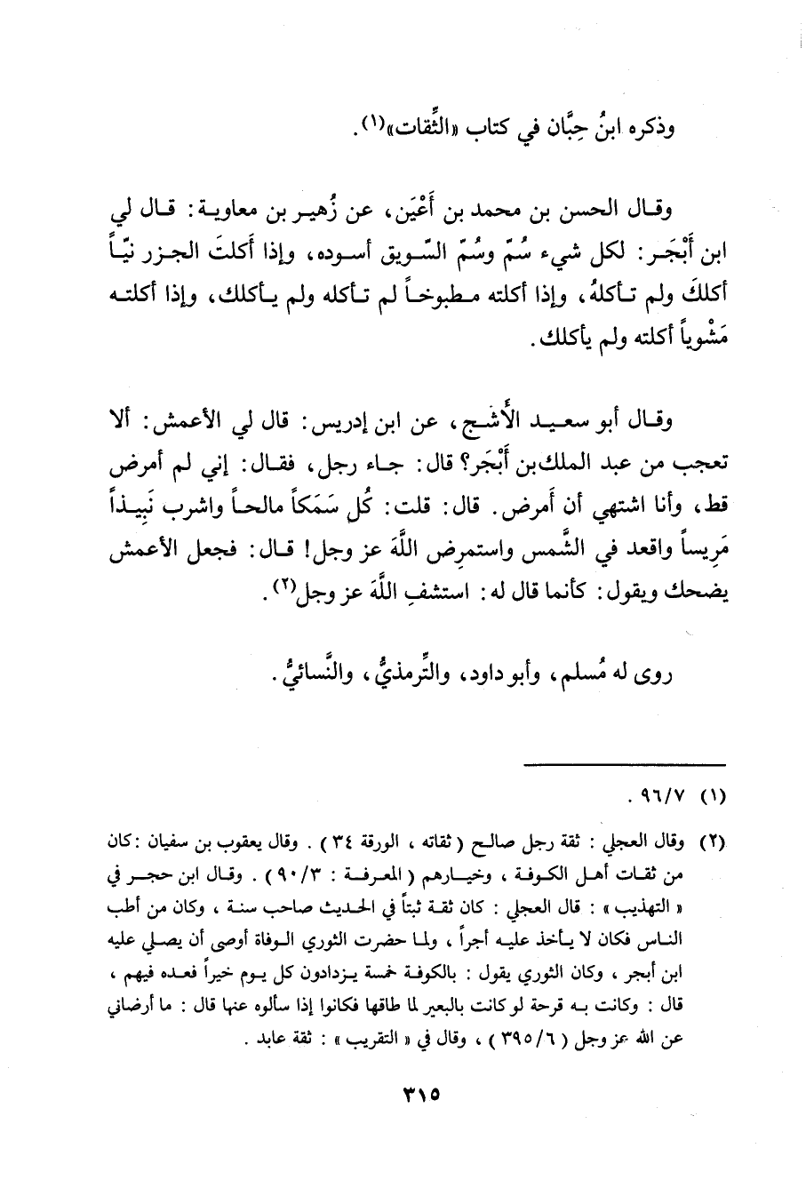 (2) وَقَال العجلي: ثقة رجل صَالِح (ثقاته، الورقة 34) . وَقَال يعقوب بْن سفيان: كان من ثقات أهل الكوفة، وخيارهم (المعرفة: 3 / 90) . وَقَال ابن حجرفي"التهذيب": قال العجلي: كَانَ ثقة ثبتا فِي الحديث صاحب سنة، وكان من أطب الناس فكان لا يأخذ عليه أجرا، ولما حضرت الثوري الوفاة أوصى أن يصلي عليه ابن أبجر، وكان الثوري يقول: بالكوفة خمسة يزدادون كل يوم خيرا فعده فيهم، قال: وكانت به قرحة لو كانت بالبعير لما طاقها فكانوا إذا سألوه عنها قال: ما أرضاني عن الله عزوجل (6 / 395) ، وَقَال في "التقريب": ثقة عابد.