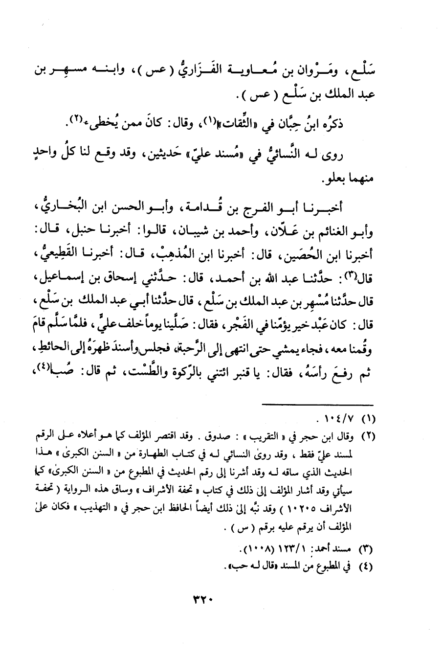 (2) وَقَال ابن حجر في "التقريب": صدوق. وقد اقتصر المؤلف كما هو أعلاه على الرقم لمسند علي فقط، وقد روى النَّسَائي له في كتاب الطهارة من"السنن الكبرى"هذا الحديث الذي ساقه له وقد أشرنا إلى رقم الحديث في المطبوع من"السنن الكبرى"كما سيأتي وقد أشار المؤلف إلى ذلك في كتاب"تحفة الاشراف"وساق هذه الرواية (تحفة الاشراف 10205) وقد نبه إلى ذلك أيضا الحافظ ابن حجر في "التهذيب"فكان على المؤلف أن يرقم عليه برقم (س) .