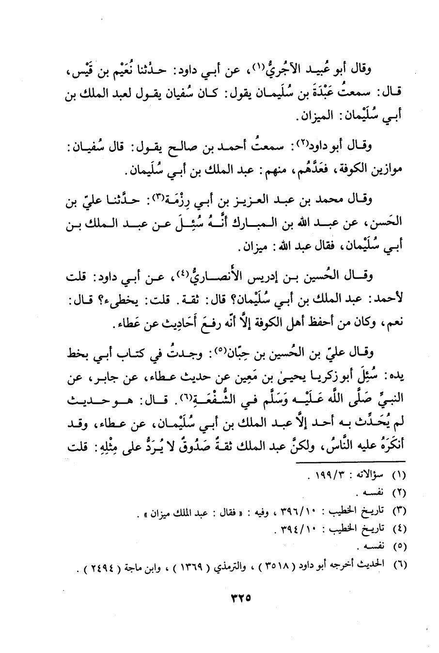وَقَال أَبُو عُبَيد الأجري (1) ، عَن أبي داود: حَدَّثَنَا نعيم بن قيس، قال: سمعت عبدة بن سُلَيْمان يقول: كان سفيان يقول لعبد الملك بن أَبي سُلَيْمان: الميزان.