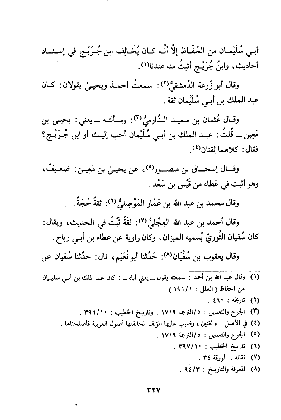 وَقَال أَحْمَد بْن عَبد اللَّهِ العجلي (7) : ثقة ثبت في الحديث، ويُقال: كان سفيان الثوري يسميه الميزان، وكان راوية عن عطاء بن أَبي رباح.