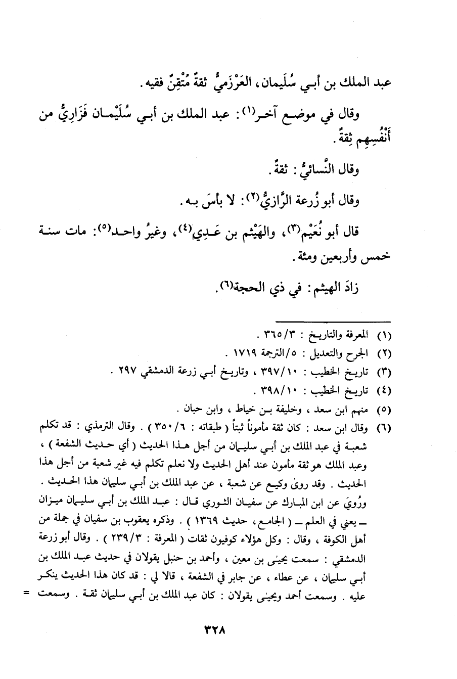 (6) وَقَال ابن سعد: كَانَ ثقة مأمونا ثبتا (طبقاته: 6 \ 350) . وَقَال التِّرْمِذِيّ: قد تكلم شعبة في عَبد المَلِك بن أَبي سُلَيْمان من أجل هذا الحديث (أي حديث الشفعة) ، وعبد الملك هو ثقة مأمون عند أهل الحديث ولا نعلم تكلم فيه غير شعبة من أجل هذا الحديث. وقد روى وكيع عن شعبة، عن عَبد المَلِك بن أَبي سُلَيْمان هذا الحديث. وروي عن ابن المبارك عن سفيان الثوري قال: عَبد المَلِك بن أَبي سُلَيْمان ميزان، يعني في العلم - (الجامع، حديث 1369) ، وذَكَره يعقوب بن سفيان في جملة من أهل الكوفة، وَقَال: وكل هؤلاء كوفيون ثقات (المعرفة: 3 \ 239) . وَقَال أبو زُرْعَة الدمشقي: سمعت يحيى بن مَعِين، وأحمد بن حنبل يقولان في حديث عَبد المَلِك بن أَبي سُلَيْمان، عن عطاء، عن جابر في الشفعة، قالا لي: قد كان هذا الحديث ينكر عليه. وسمعت أحمد ويحيى يقولان: كان عَبد المَلِك بن أَبي سُلَيْمان ثقة. وسمعت =