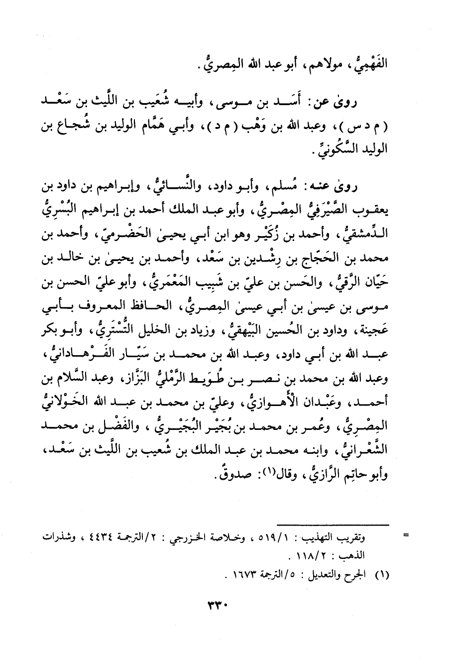 رَوَى عَن: أسد بن موسى، وأبيه شعيب بن الليث بْن سعد (م د س) ، وعبد الله بْن وهب (م د) ، وأبي همام الوليد بن شجاع بن الوليد السكوني.