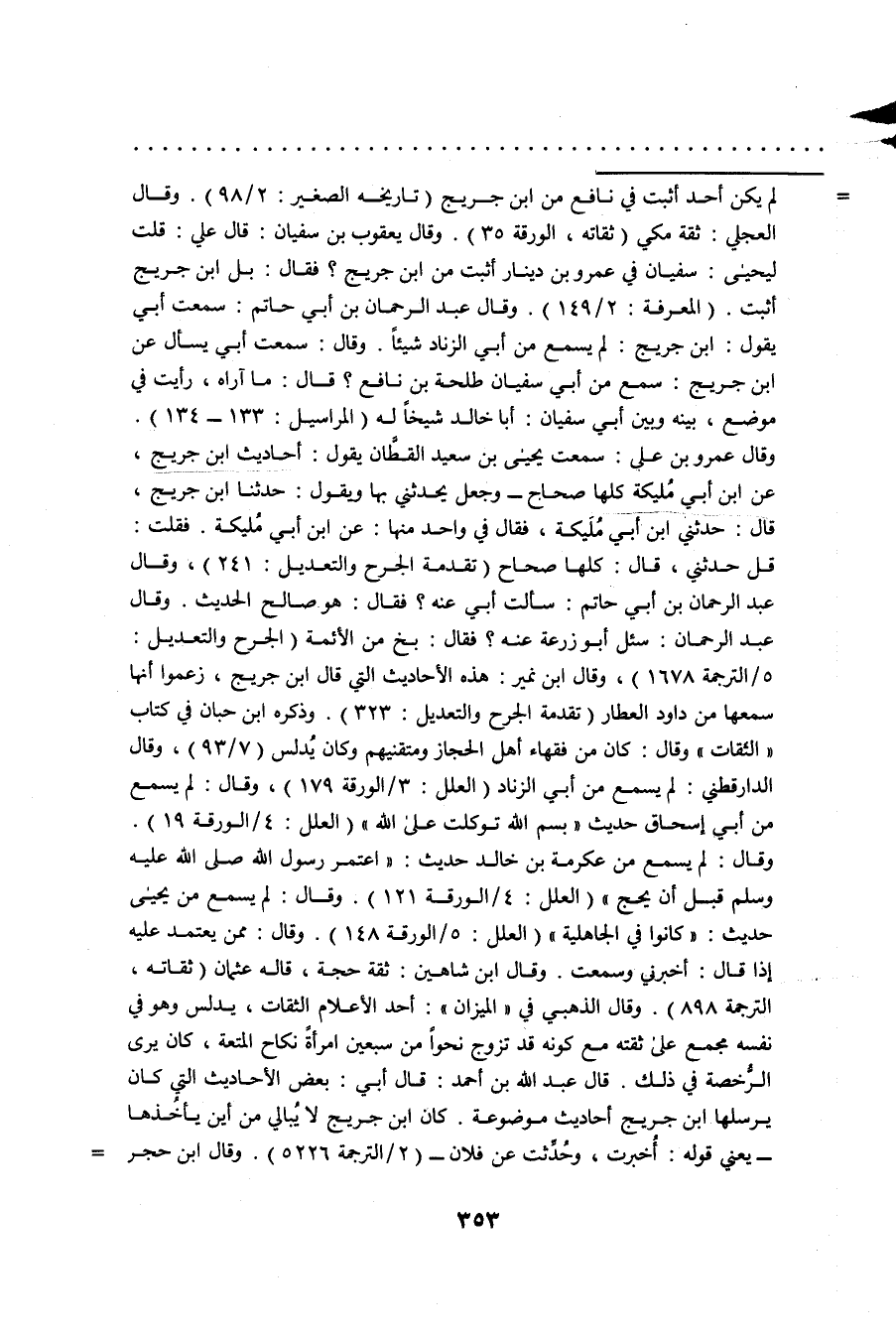 = لم يكن أحد أثبت في نافع من ابن جُرَيْج (تاريخه الصغير: 2 / 98) . وَقَال العجلي: ثقة مكي (ثقاته، الورقة 35) . وَقَال يعقوب بن سفيان: قال علي: قلت ليحيى: سفيان في عَمْرو بن دينار أثبت من ابن جُرَيْج؟ فقال: بل ابن جُرَيْج أثبت. (المعرفة: 2 / 149) . وَقَال عبد الرحمن بن أَبي حاتم: سمعت أبي يقول: ابن جُرَيْج: لم يسمع من أبي الزناد شيئا. وَقَال: سمعت أبي يسأل عن ابن جُرَيْج: سمع من أبي سفيان طلحة بن نافع؟ قال: ما آراه، رأيت في موضع، بينه وبين أبي سفيان: أبا خالد شيخا له (المراسيل: 133 - 134) . وَقَال عَمْرو بن علي: سمعت يحيى بن سَعِيد القطان يقول: أحاديث ابن جُرَيْج، عن ابن أَبي مليكة كلها صحاح - وجعل يحدثني بها ويقول: حَدَّثَنَا ابن جُرَيْج، قال: حدثني ابن أَبي مليكة، فقال في واحد منها: عن ابن أَبي مليكة. فقلت: قل حدثني، قال: كلها صحاح (تقدمة الجرح والتعديل: 241) ، وَقَال عبد الرحمن بن أَبي حاتم: سَأَلتُ أبي عنه؟ فقال: هو صالح الحديث. وَقَال عبد الرحمن: سئل أبو زُرْعَة عنه؟ فقال: بخ من الأئمة (الجرح والتعديل: 5 / الترجمة 1678) ، وَقَال ابن نمير: هذه الاحاديث التي قال ابن جُرَيْج زعموا أنها سمعها من داود العطار (تقدمة الجرح والتعديل: 323) ، وذَكَره ابنُ حِبَّان في كتاب "الثقات" وَقَال: كان من فقهاء أهل الحجاز ومتقنيهم وكان يدلس (7 / 93) ، وَقَال الدَّارَقُطْنِيُّ: لم يسمع من أبي الزناد (العلل: 3 / الورقة 179) ، وَقَال: لم يسمع من أبي إسحاق حديث: "بسم الله توكلت على الله" (العلل: / 4 / الورقة 19) . وَقَال: لم يسمع من عكرمة بن خالد حديث: اعتمر رسول الله صلى الله عليه وسلم قبل أن يحج" (العلل: 4 / الورقة 121) . وَقَال: لم يسمع من يحيى حديث: كانوا في الجاهلية" (العلل: 5 / الورقة 148) . وَقَال: ممن يعتمد عليه إذا قال: أخبرني وسمعت. وَقَال ابن شاهين: ثقة حجة، قاله عثمان (ثقاته، الترجمة 898) . وَقَال الذهبي في "الميزان": أحد الاعلام الثقات، يدلس وهو في نفسه مجمع على ثقته مع كونه قد تزوج نحوا من سبعين امرأة نكاح المتعة، كان يرى الرخصة في ذلك. قال عَبد الله بن أحمد: قال أبي: بعض الاحاديث التي كان يرسلها ابن جُرَيْج أحاديث موضوعة. كان ابن جُرَيْج لا يبالي من أين يأخذها، يعني قوله: أخبرت، وحدثت عن فلان - (2 / الترجمة 5226) . وَقَال ابن حجر =