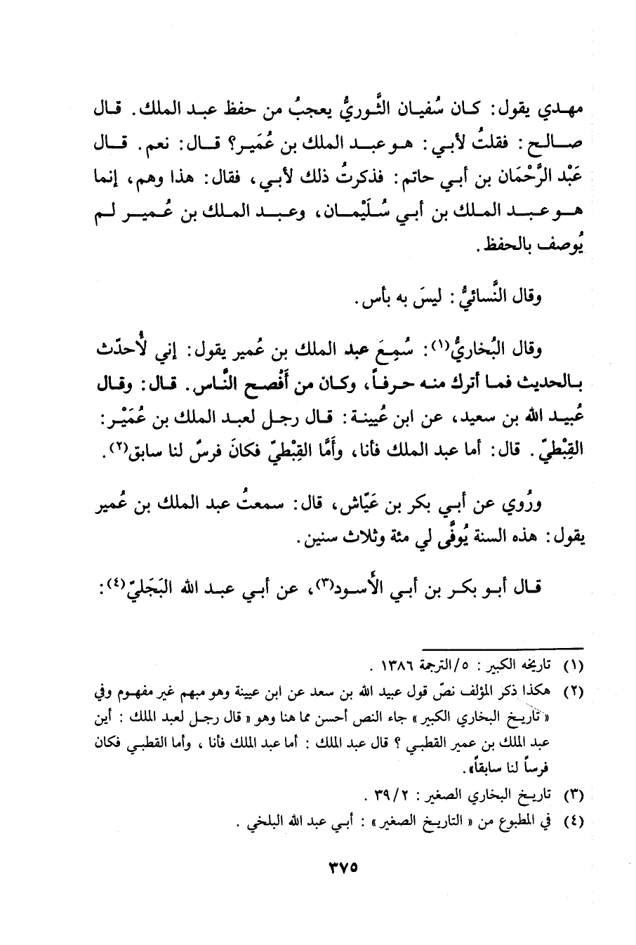 (2) هكذا ذكر المؤلف نص قول عُبَيد اللَّه بْن سعد عن ابن عُيَيْنَة وهو مبهم غير مفهوم وفي "تاريخ البخاري الكبير"جاء النص أحسن مما هنا وهو"قال رجل لعبد الملك: أين عَبد المَلِك بن عُمَير القطبي؟ قال عَبد المَلِك: أما عَبد المَلِك فأنا، وأما القطبي فكان فرسا لنا سابقا.