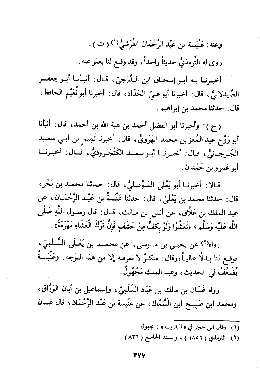 قَالا: أخبرنا أَبُو يَعْلَى الموصلي، قال: حَدَّثَنَا مُحَمَّدُ بْنُ بَحْرٍ، قال: حَدَّثَنَا مُحَمَّدُ بْنُ يَعْلَى، قال: حَدَّثَنَا عَنْبَسَةُ بْنُ عَبْدِ الرَّحْمَنِ، عَنْ عَبد المَلِك بْنِ عَلاقٍ، عَنْ أَنَسِ بْنِ مَالِكٍ، قال: قال رَسُولُ اللَّهِ صلى الله عليه وسلم،"تَعَشَّوْا ولَوْ بِكَفٍّ مِنْ حَشَفٍ فَإِنَّ تَرْكَ الْعَشَاءِ مَهْرَمَةٌ.