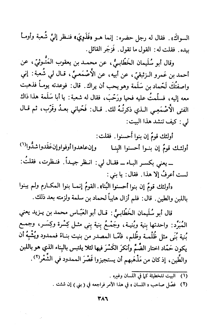 قال أبو سُلَيْمان الخطابي: قال أبو العباس محمد بن يَزِيدَ يعني المبرد: واحدتها بنية وبنية، وجمع بنية بني مثل كسرة وكسر، وجمع بنية بني مثل ظلمة وظلم، فأما المصدر من بنيت بناء فممدود ويشبه أن يكون حماد اختار الضم وأنكر الكسر فيها لئلا يلتبس بالبناء الذي هو باللبن والطين، إذ كان من مذهبهم أن يستجيزوا قصر الممدود في الشعر (2) .