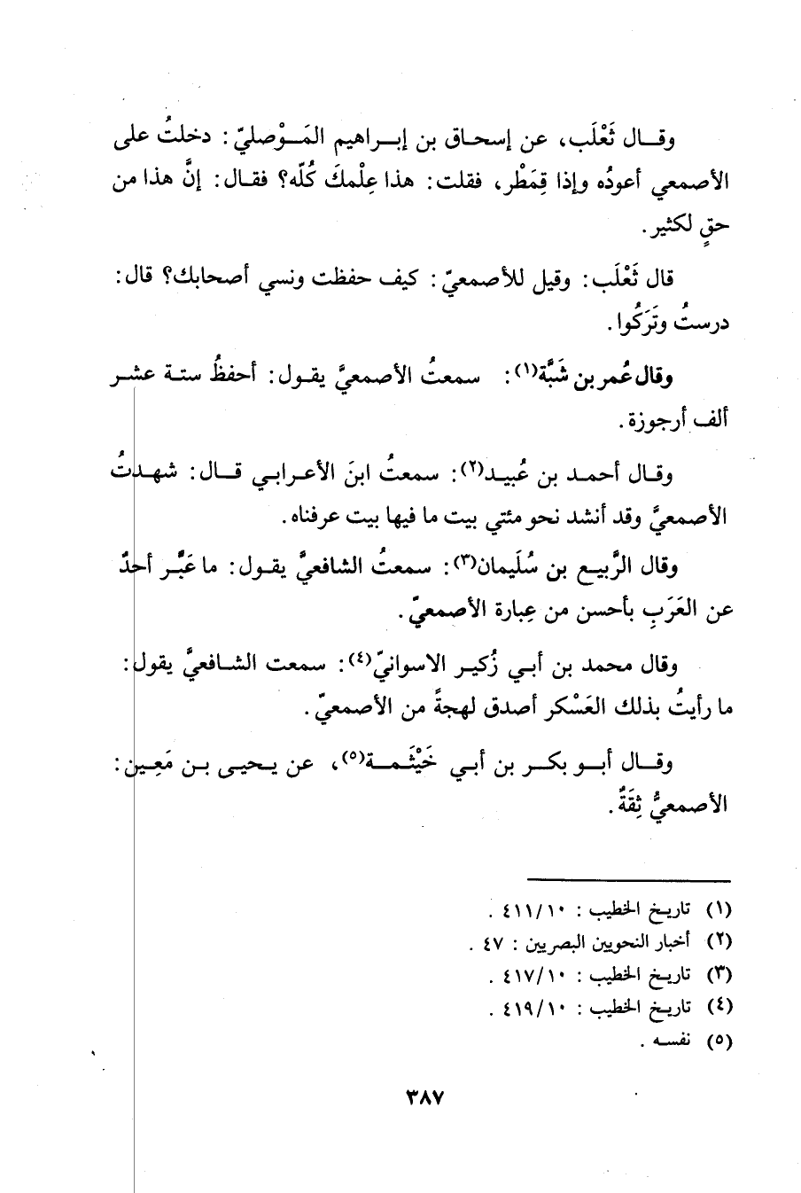 وَقَال ثعلب، عن إسحاق بن إبراهيم الموصلي: دخلت على الأَصْمَعِيّ أعوده وإذا قمطر، فقلت: هذا علمك كله؟ فقال إن هذا من حق لكثير. قال ثعلب: وقيل للأصمعي: كيف حفظت ونسي أصحابك؟ قال: درست وتركوا.