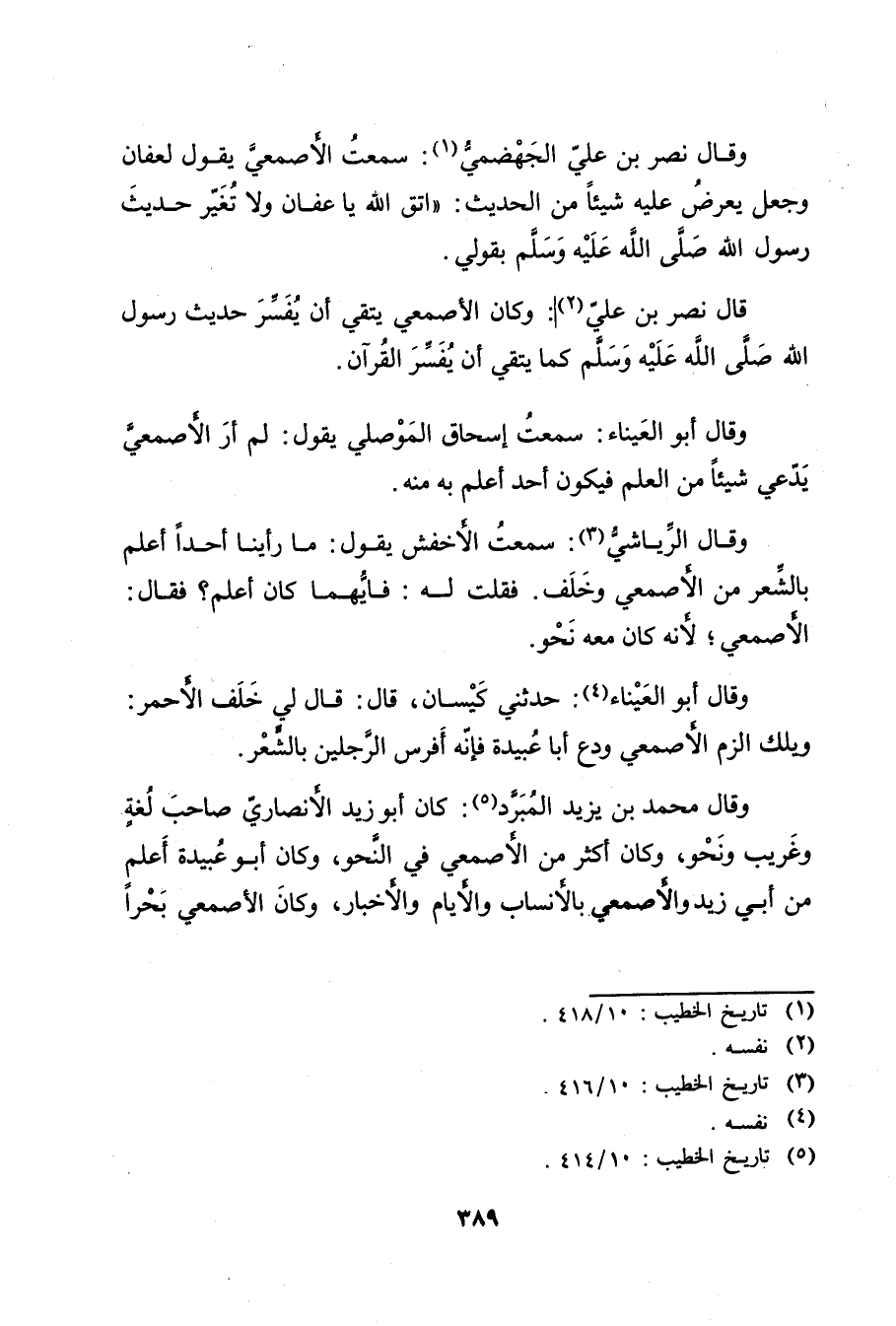 قال نصر بن علي (2) : وكان الأَصْمَعِيّ يتقي أن يفسر حديث رسول اللَّهِ صلى الله عليه وسلم كما يتقي أن يفسر القرآن.