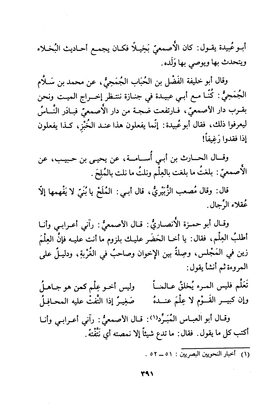 وَقَال أبو حمزة الأَنْصارِيّ: قال الأَصْمَعِيّ: رآني أعرابي وأنا أطلب العلم، فقال: يا أخا الحضر عليك بلزوم ما أنت عليه فإن العلم زين في المجلس، وصلة بين الأَخُوان وصاحب في الغربة، ودليل على المروءة ثم أنشأ يقول:
