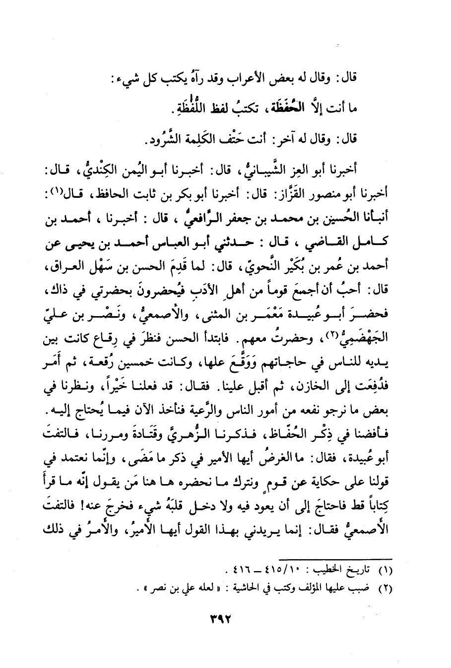 أَخْبَرَنَا أَبُو الْعِزِّ الشَّيْبَانِيُّ، قال: أَخْبَرَنَا أَبُو اليُمْنِ الْكِنْدِيُّ، قال: أَخْبَرَنَا أَبُو مَنْصُورٍ الْقَزَّازُ: قال: أخبرنا أَبُو بَكْرِ بْنُ ثَابِتٍ الحافظ، قال (1) : أنبأنا الحسين بْن مُحَمَّدِ بْنِ جعفر الرافعي، قال: أَخْبَرَنَا، أَحْمَد بْن كامل الْقَاضِي، قال: حدثني أَبُو العباس أَحْمَد بْن يحيى عَن أحمد بْن عُمَر بن بكير النحوي، قال: لما قدم الحسن بن سهل العراق، قال: أحب أن أجمع قوما من أهل الأدب فيحضرون بحضرتي في ذاك، فحضر أبو عُبَيدة معمر بن المثنى، والأَصْمَعِيّ، ونصر بن علي الجهضمي (2) ، وحضرت معهم. فابتدأ الحسن فنظر في رقاع كانت بين يديه للناس في حاجاتهم ووقع علها، وكانت خمسين رقعة، ثم أمر فدفعت إلى الخازن، ثم أقبل علينا. فقال: قد فعلنا خيرا، ونظرنا في بعض ما نرجو نفعه من أمور الناس والرعية فنأخذ الآن فيما يحتاج إليه. فأفضنا في ذكر الحفاظ، فذكرنا الزُّهْرِيّ وقتادة ومررنا، فالتفت أبو عُبَيدة، فقال: ما الغرض أيها الأمير في ذكر ما مضى، وإنما نعتمد في قولنا على حكاية عن قوم ونترك ما نحضره ها هنا من يقول إنه ما قرأ كتابا قط فاحتاج إلى أن يعود فيه ولا دخل قلبه شيء فخرج عنه! فالتفت الأَصْمَعِيّ فقال: إنما يريدني بهذا القول أيها الأمير، والأمر في ذلك