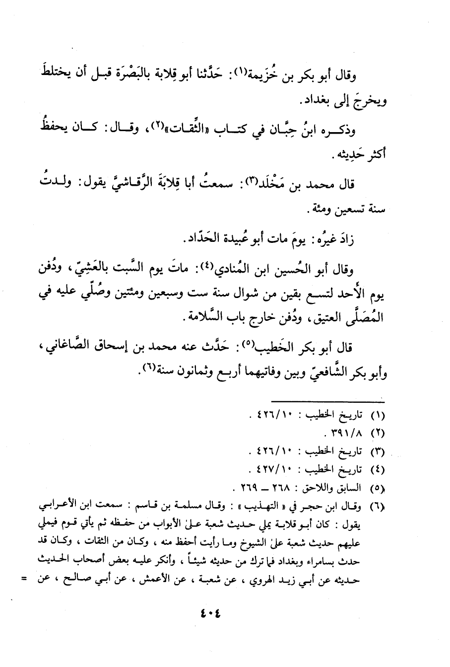 وَقَال أَبُو بَكْر بْن خزيمة (1) : حَدَّثَنَا أبو قلابة بالبصرة قبل أن يختلط ويخرج إلى بغداد.