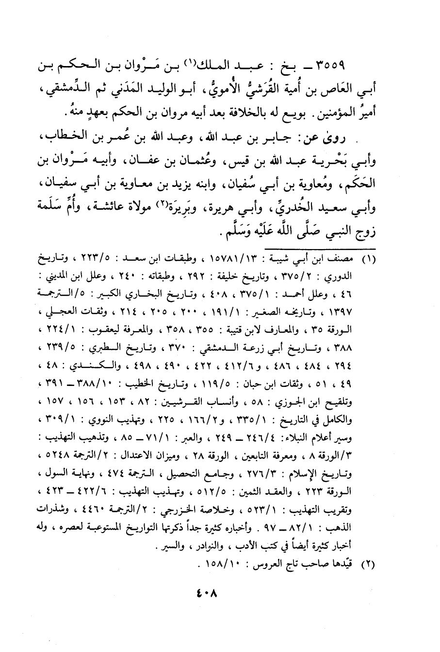 3559 - بخ: عَبد المَلِك بن مروان بْن الحكم بْن أَبي العاص بن أمية الْقُرَشِيّ الأُمَوِي (1) ، أبو الوليد المدني ثم الدمشقي، أمير المؤمنين. بويع له بالخلافة بعد أبيه مروان بن الحكم بعهد منه.