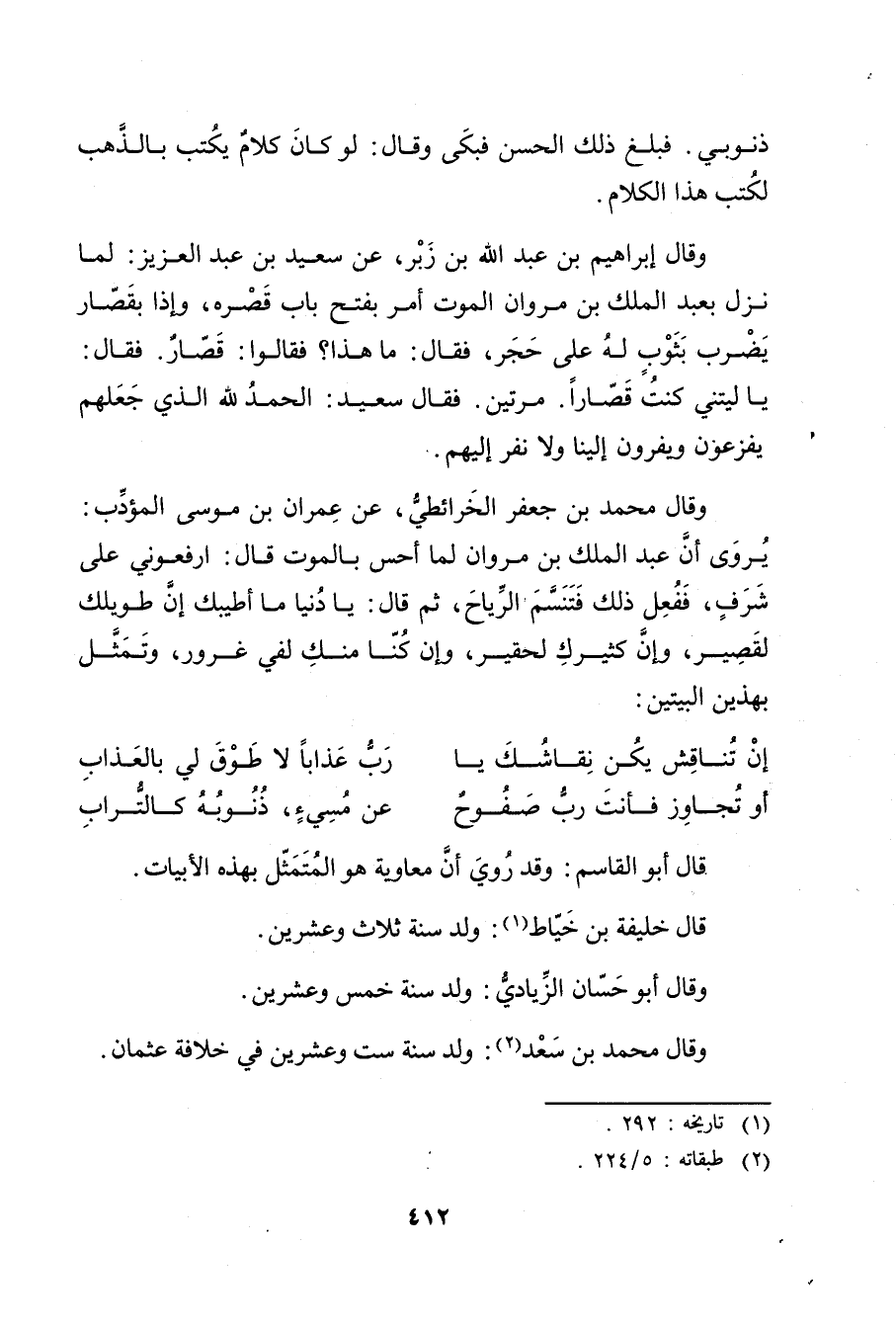 وَقَال محمد بن جعفر الخرائطي، عن عِمْران بن موسى المؤدب: يروى أن عَبد المَلِك بن مروان لما أحس بالموت قال: ارفعوني على شرف، ففعل ذلك فتنسم الرياح، ثم قال: يا دنيا ما أطيبك إن طويلك لقصير، وإن كثيرك لحقير، وان كنا منك لفي غرور، وتمثل بهذين البيتين: