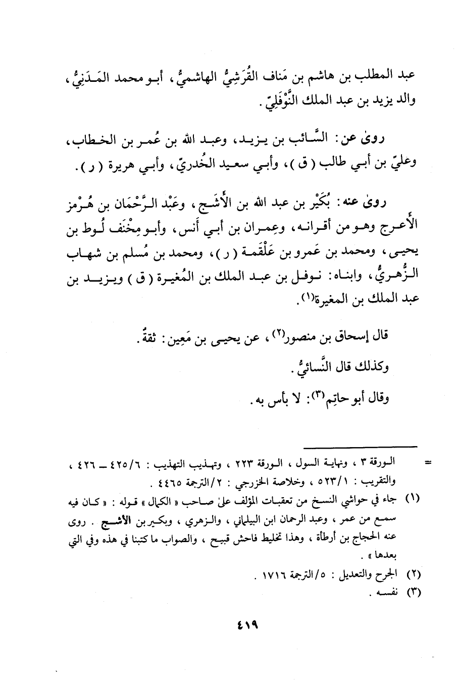 = الورقة 3، ونهاية السول، الورقة 223، وتهذيب التهذيب: 6 / 425 - 426، والتقريب: 1 / 523، وخلاصة الخزرجي: 2 / الترجمة 4465.