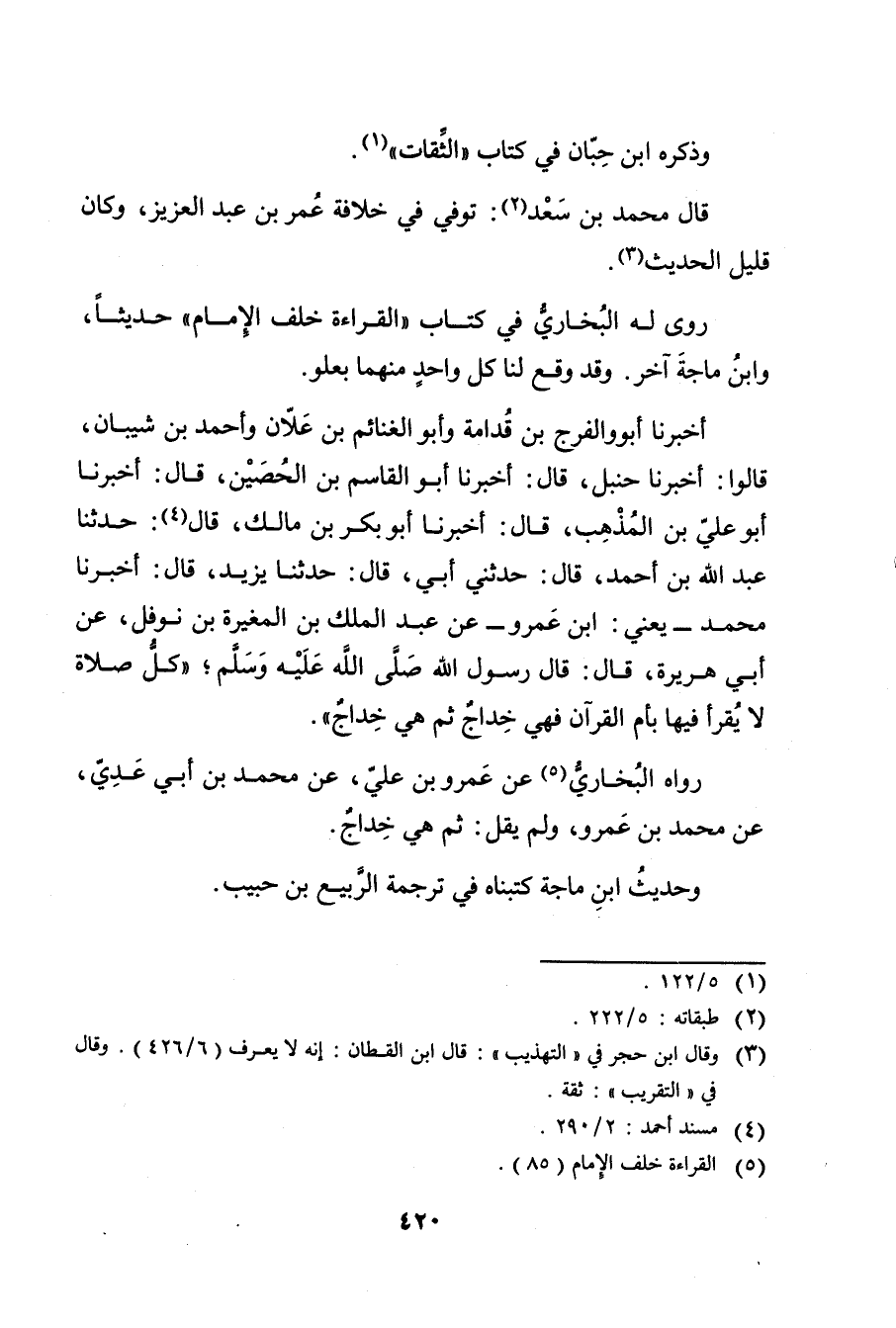 رَوَاهُ الْبُخَارِيُّ (5) عَنْ عَمْرو بْن عَلِيٍّ، عَنْ مُحَمَّدُ بْنُ أَبي عَدِيٍّ، عَنْ مُحَمَّدِ بْنِ عَمْرو، ولَمْ يَقُلْ: ثُمَّ هِيَ خِدَاجٌ.