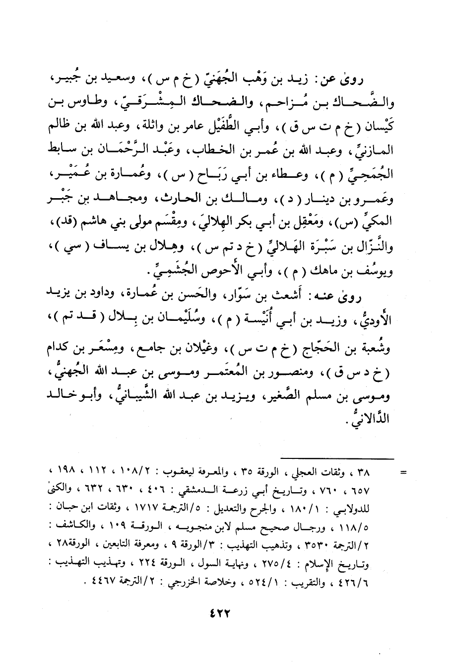 = 38، وثقات العجلي، الورقة 35، والمعرفة ليعقوب: 2 / 108، 112، 198، 657، 760، وتاريخ أبي زرعة الدمشقي: 406، 630، 632، والكنى للدولابي: 1 / 180، والجرح والتعديل: 5 / الترجمة 1717، وثقات ابن حبان: 5 / 118، ورجال صحيح مسلم لابن منجويه، الورقة 109، والكاشف: 2 / الترجمة 3530، وتذهيب التهذيب: 3 / الورقة 9، ومعرفة التابعين، الورقة 28، وتاريخ الاسلام: 4 / 275، ونهاية السول، الورقة 224، وتهذيب التهذيب: 6 / 426، والتقريب: 1 / 524، وخلاصة الخزرجي: 2 / الترجمة 4467.
