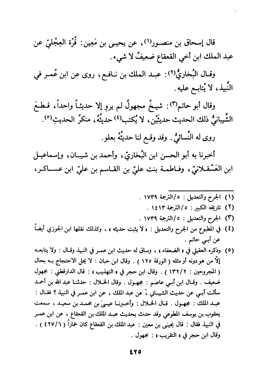(5) وذكره العقيلي في "الضعفاء"، وساق له حديث ابن عُمَر في النبيذ وَقَال: ولا يتابعه إلا من هو دونه أو مثله (الورقة 125) . وَقَال ابن حبان: لا يحل الاحتجاج به بحال (المجروحين: 2 / 132) . وَقَال ابن حجر في "التهذيب": قال الدارقطني: مجهول ضعيف. وَقَال ابن أَبي عاصم: مجهول. وَقَال الخلال: حَدَّثَنَا عَبد الله بن أحمد سَأَلتُ أبي عن حديث الشيباني، عن عَبد المَلِك، عن ابن عُمَر في النبيذ؟ فقال: عَبد المَلِك: مجهول. قال الخلال: وأخبرنا عيسى بن محمد بن سَعِيد، سمعت يعقوب بن يوسف المطوعي وقد حدث بحديث عَبد المَلِك بن القعقاع، عن ابن عُمَر في النبيذ فقال: قال يحيى بن مَعِين: عَبد المَلِك بن القعقاع كان خمارا (6 / 427) . وَقَال ابن حجر في "التقريب": مجهول.
