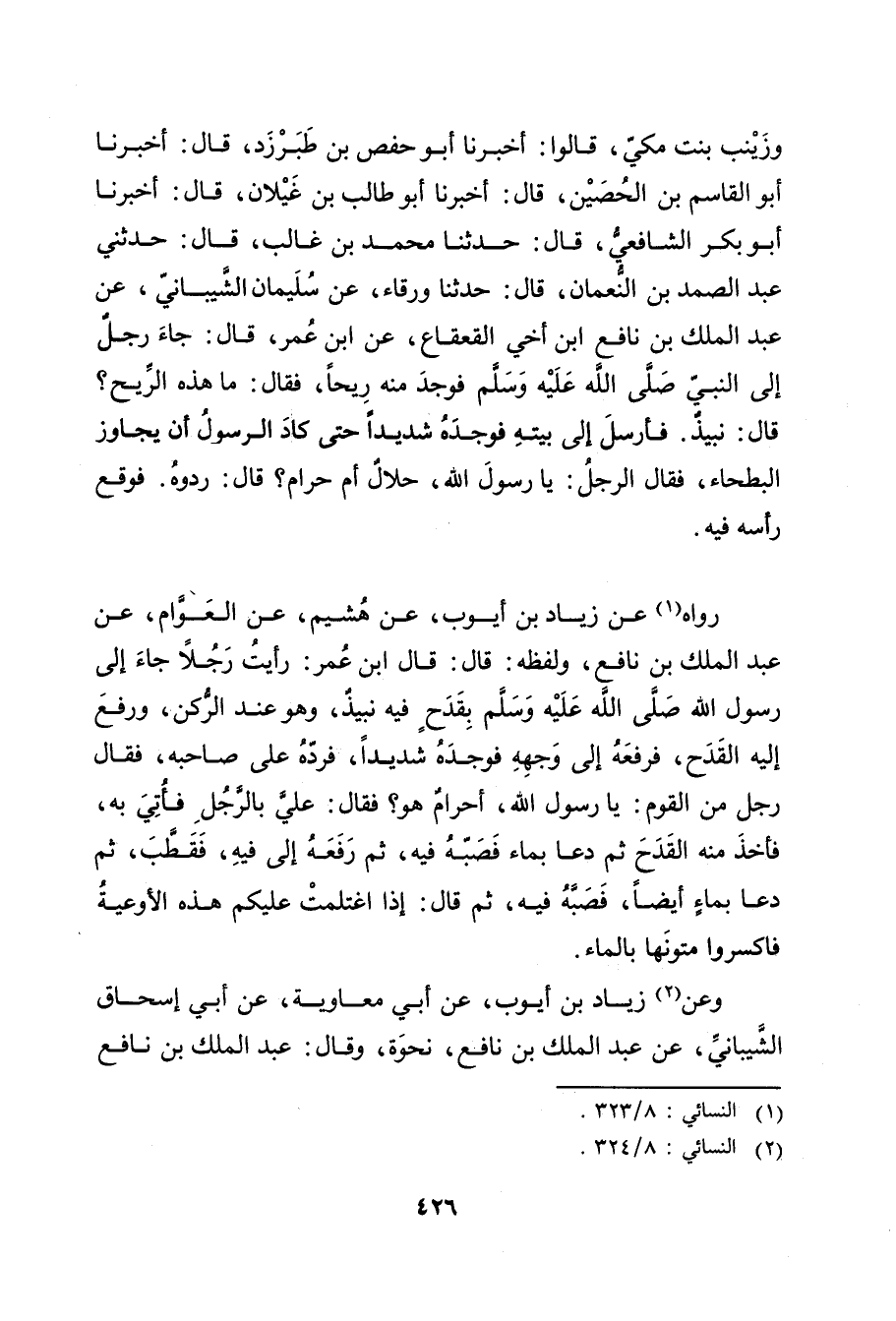 وزَيْنَبُ بِنْتُ مَكِّيٍّ، قَالُوا: أَخْبَرَنَا أبو حفص بن طَبَرْزَذَ، قال: أَخْبَرَنَا أبو القاسم بْن الحصين، قال: أخبرنا أَبُو طالب بْنُ غَيْلانَ، قال: أَخْبَرَنَا أَبُو بَكْرٍ الشَّافِعِيُّ، قال: حَدَّثَنَا مُحَمَّدُ بْنُ غَالِبٍ، قال: حَدَّثَنِي عَبْدُ الصمد بن النعان، قال: حَدَّثَنَا ورْقَاءُ، عَنْ سُلَيْمان الشيباني، عن عَبد المَلِك بن نَافِعٍ ابْنِ أَخِي الْقَعْقَاعِ، عَنِ ابْنِ عُمَر، قال: جَاءَ رَجُلٌ إِلَى النَّبِيّ صَلَّى اللَّهُ عَلَيْهِ وسلم فَوَجَدَ مِنْهُ رِيحًا، فَقَالَ: مَا هَذِهِ الرِّيحُ؟ قال: نَبِيذٌ. فَأَرْسَلَ إِلَى بَيْتِهِ فَوَجَدَهُ شَدِيدًا حَتَّى كَادَ الرَّسُولُ أَنْ يُجَاوِزَ الْبَطْحَاءَ، فَقَالَ الرَّجُلُ: يَا رَسُولَ اللَّهِ، حَلالٌ أَمْ حَرَامٌ؟ قال: رُدُّوهُ. فَوَقَعَ رَأْسُهُ فِيهِ.