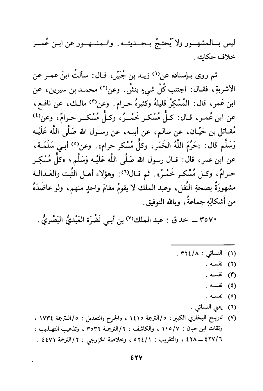 ثم روى بإسناده عن (1) زيد بن جبير، قال: سألت ابن عُمَر عن الأشربة، فقال: اجتنب كل شيء ينش. وعَنْ (2) مُحَمَّدِ بْنِ سيرين، عَنِ ابْنِ عُمَر، قال: المسكر قليله وكثيره حرام. وعن (3) مالك، عَنْ نَافِعٍ، عَنِ ابْنِ عُمَر، قال: كل مسكر خمر، وكل مسكر حرام، وعَنْ (4) مُقَاتِلِ بْنِ حَيَّانَ، عَنْ سَالِمٍ، عَن أَبِيهِ، عَنْ رَسُولِ اللَّهِ صلى الله عليه وسلم قال: حرم اللَّه الخمر، وكل مُسْكِرٍ حَرَامٌ". وعَنْ (5) أَبِي سَلَمَةَ، عَنِ ابْنِ عُمَر، قال: قال رَسُول اللَّهِ صلى الله عليه وسلم،"كُلُّ مُسْكِرٍ حَرَامٌ، وكُلُّ مُسْكِرٍ خَمْرٌ". ثم قال (6) : وهؤلاء أهل الثبت والعدالة مشهورة بصحة النقل، وعبد الملك لا يقوم مقام واحد منهم، ولو عاضده من أشكاله جماعة، وبالله التوفيق.