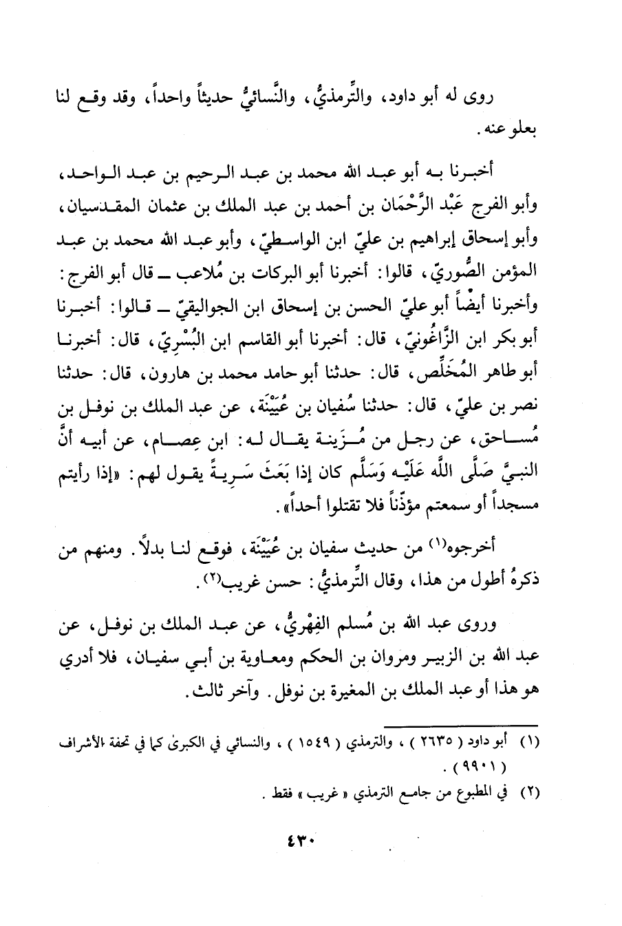 أَخْبَرَنَا بِهِ أَبُو عَبْد اللَّهِ مُحَمَّد بْن عَبد الرَّحِيمِ بْنِ عَبْدِ الْوَاحِدِ، وأبو الفرج عَبْد الرَّحْمَنِ بْن أَحْمَد بْن عَبد المَلِك بْن عُثْمَانَ الْمَقْدِسِيَّانِ، وأَبُو إِسْحَاقَ إِبْرَاهِيمُ بن علي ابن الواسطي، وأَبُو عَبْد اللَّهِ محمد بْنُ عَبْدِ الْمُؤْمِنِ الصُّورِيُّ، قَالُوا: أخبرنا أَبُو الْبَرَكَاتِ بْنُ مُلاعِبٍ، قال أَبُو الْفَرَجِ: وأخبرنا أَيْضًا أَبُو عَلِيٍّ الْحَسَنُ بْنُ إِسْحَاقَ ابن الْجَوَالِيقِيُّ - قَالُوا: أَخْبَرَنَا أَبُو بَكْرٍ بْنِ الزَّاغُونِيِّ، قال: أَخْبَرَنَا أَبُو القاسم ابن الْبُسْرِيِّ، قال: أَخْبَرَنَا أَبُو طَاهِرٍ الْمُخَلِّصُ، قال: حَدَّثَنَا أَبُو حَامِدٍ مُحَمَّدُ بْنُ هَارُونَ، قال: حَدَّثَنَا نَصْرُ بْنُ عَلِيٍّ، قال: حَدَّثَنَا سُفْيَانُ بْنُ عُيَيْنَة، عن عَبد المَلِك بْن نوفل بْن مساحق، عَنْ رَجُلٍ مُنْ مُزَيْنَةَ يُقَالُ لَهُ: ابْنُ عِصَامٍ، عَن أَبِيهِ أَنَّ النَّبِيَّ صلى الله عليه وسلم كَانَ إِذَا بَعَثَ سَرِيَّةً يَقُولُ لَهُمْ: إِذَا رَأَيْتُمْ مَسْجِدًا أَوْ سَمِعْتُمْ مُؤَذِّنًا فَلا تَقْتُلُوا أَحَدًا.