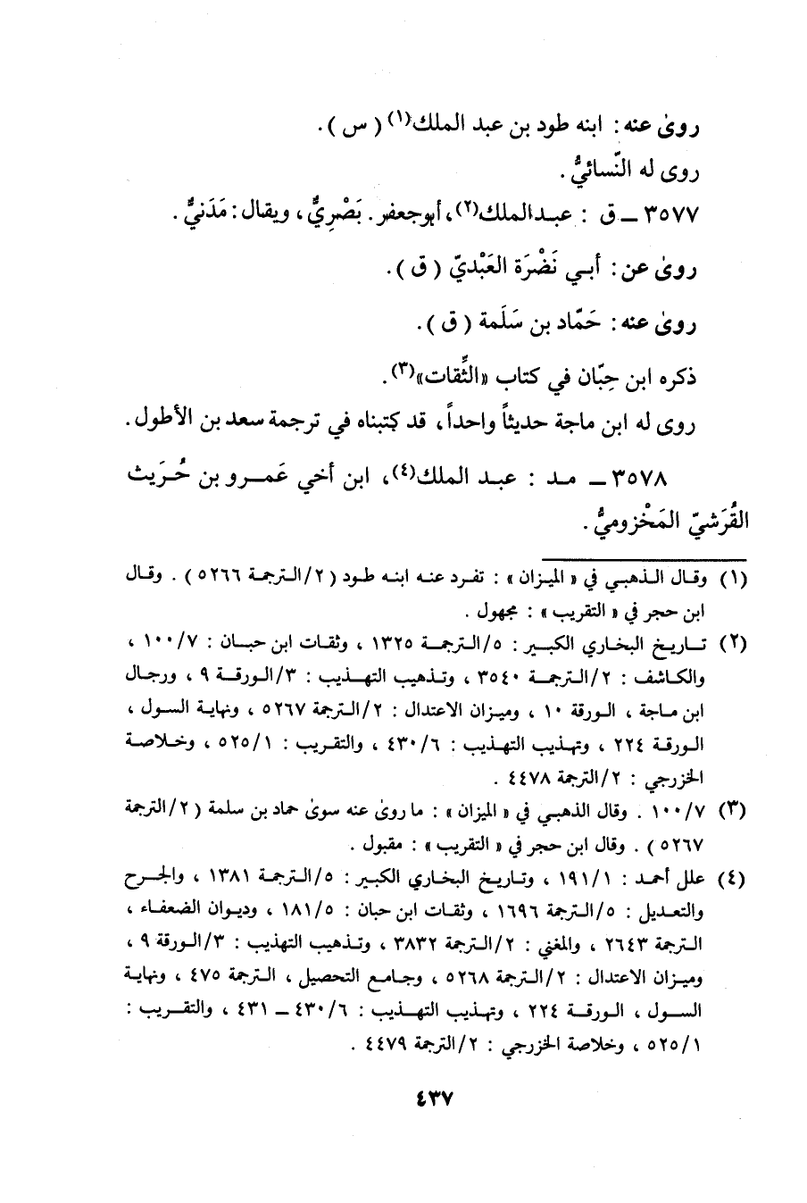 (2) تاريخ البخاري الكبير: 5 / الترجمة 1325، وثقات ابن حبان: 7 / 100، والكاشف: 2 / الترجمة 3540، وتذهيب التهذيب: 3 / الورقة 9، ورجال ابن ماجة، الورقة 10، وميزان الاعتدال: 2 / الترجمة 5267، ونهاية السول، الورقة 224، وتهذيب التهذيب: 6 / 430، والتقريب: 1 / 525، وخلاصة الخزرجي: 2 / الترجمة 4478.